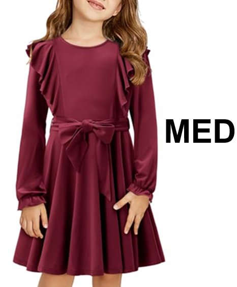 GIRLS Long Sleeve Ruffle Elegant Flowy Swing Dress with Belt- MEDIUM - burgundy RED