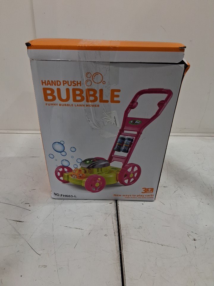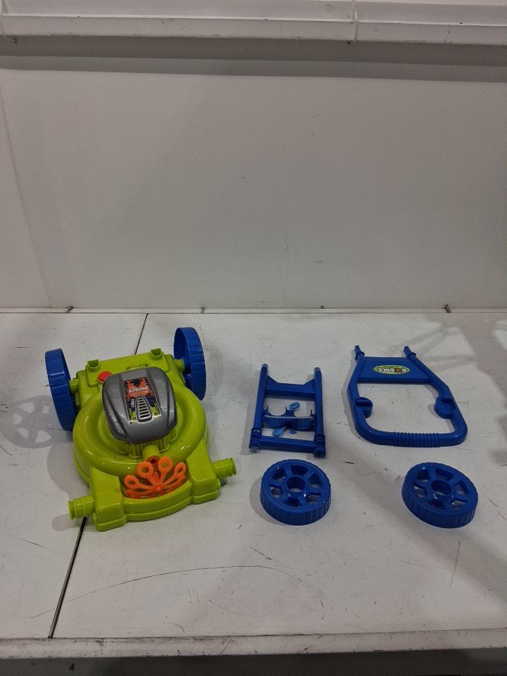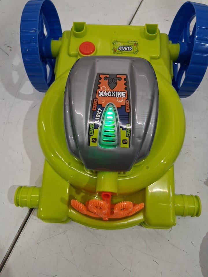 kids BUBBLE push toy lawn mower bubble blower with lights and music - 18" handle height - green / blue (model: fh663-l)