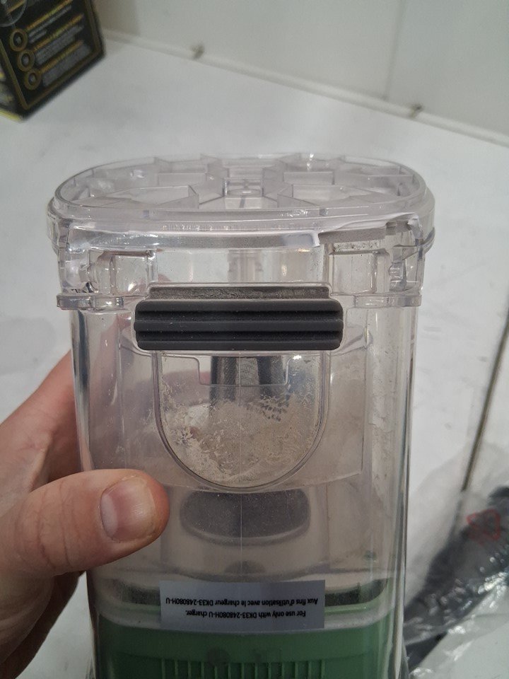 Considerable amount of dust inside the dust collector and well as a minor crack on the dust collector itself.