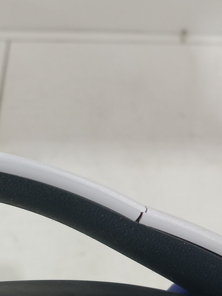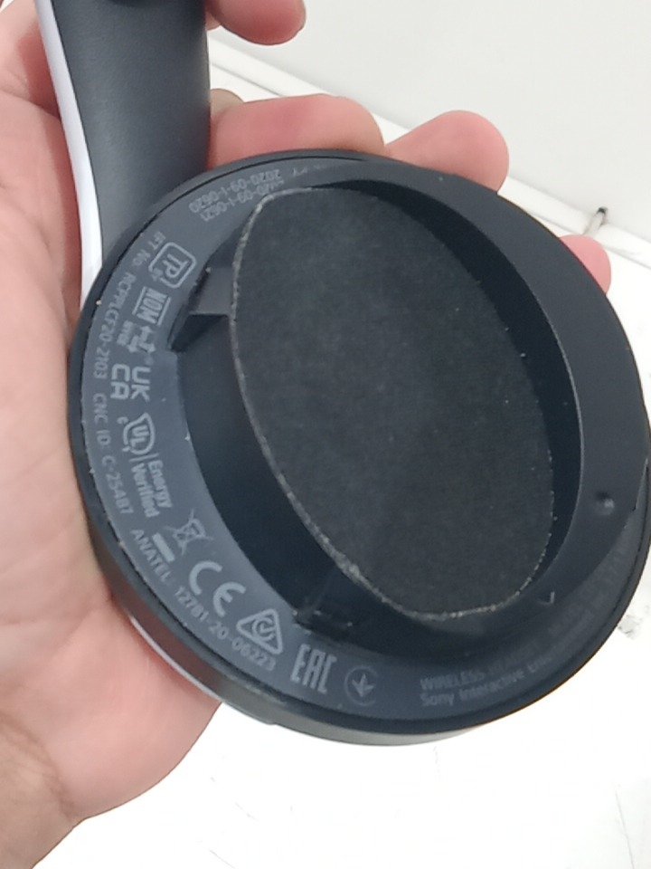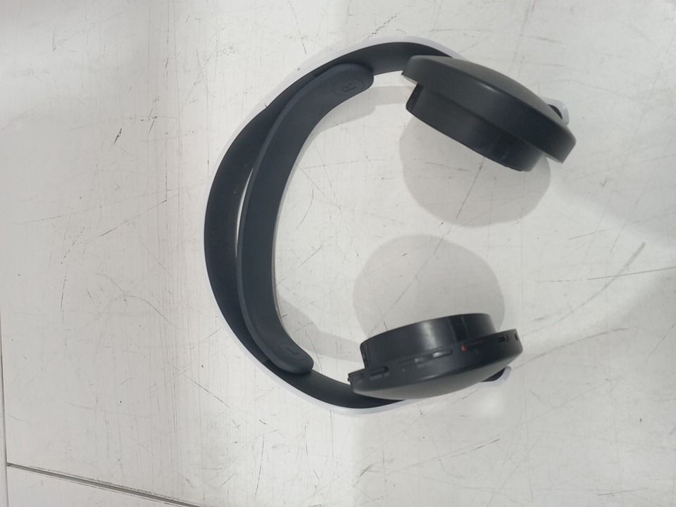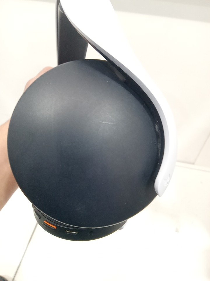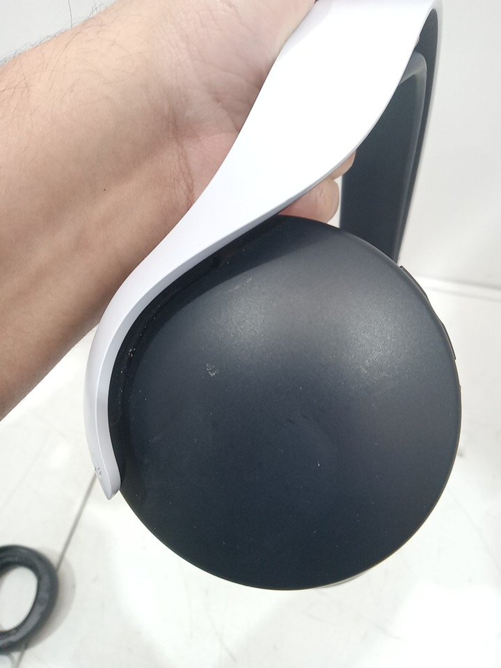 The left ear pad has a broken clip and cannot be installed properly; it may need replacement. The top right side of the neckband is bent from previous use, and there are scratch marks on the outer sides of the ear cups. The headset has been tested for power and functionality by connecting it to a PS5. (Pleas see photos)