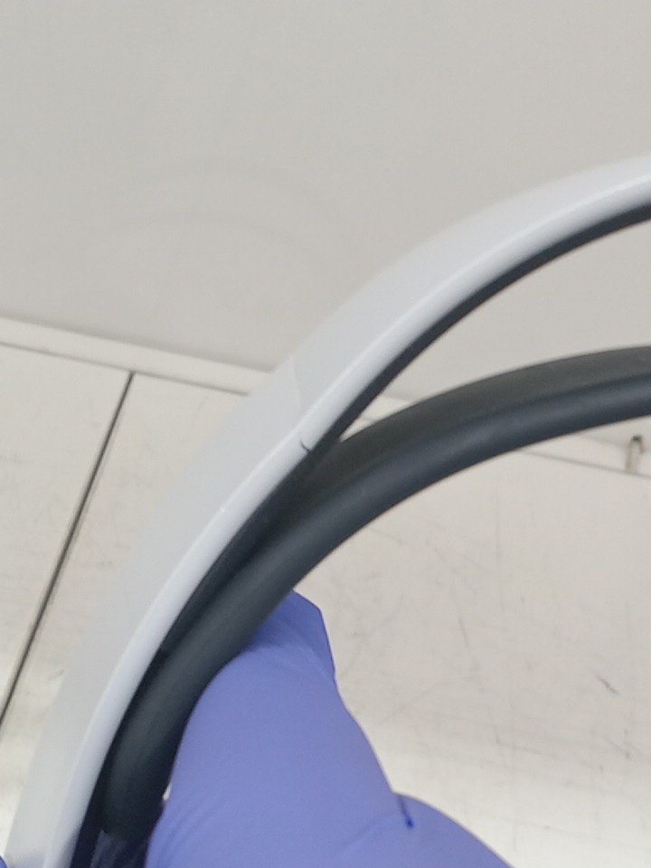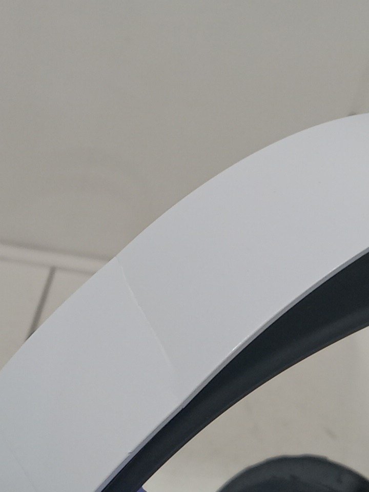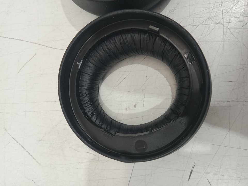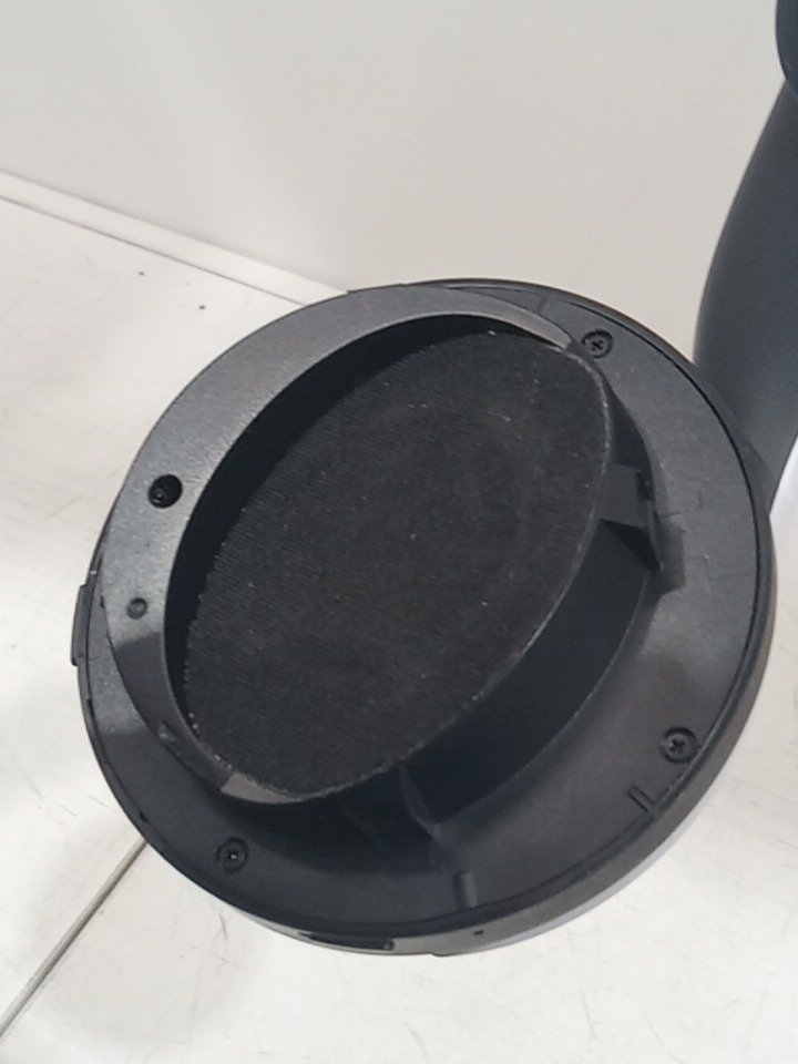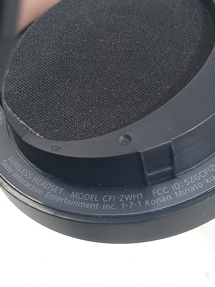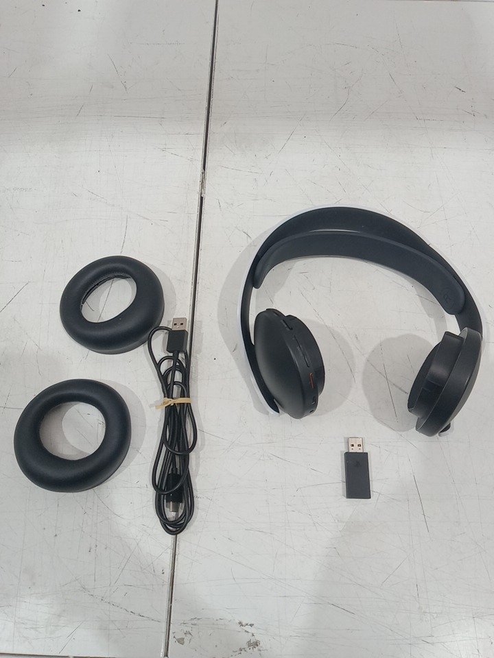 The left ear pad has a broken clip and cannot be installed properly; it may need replacement. The top right side of the neckband is bent from previous use, and there are scratch marks on the outer sides of the ear cups. The headset has been tested for power and functionality by connecting it to a PS5. (Pleas see photos)