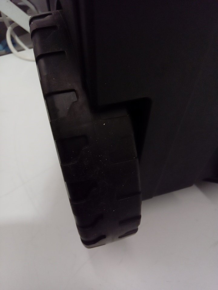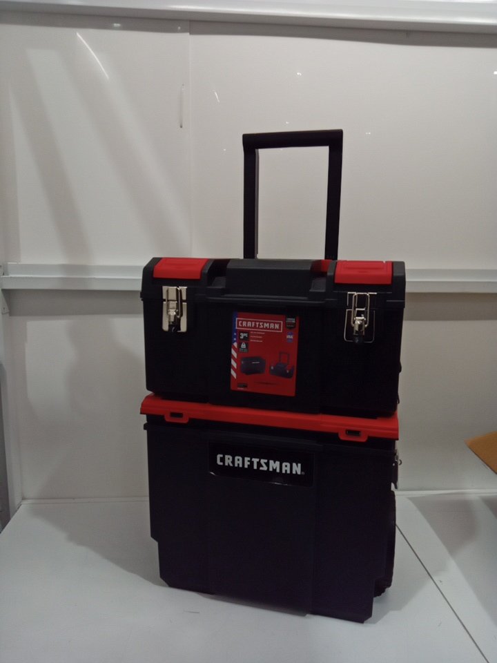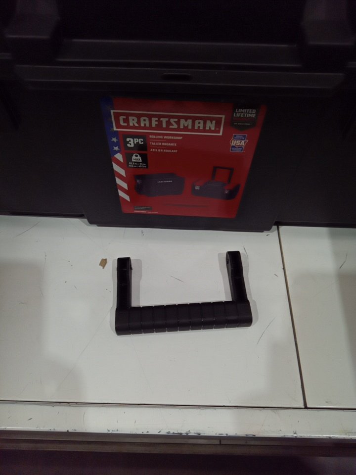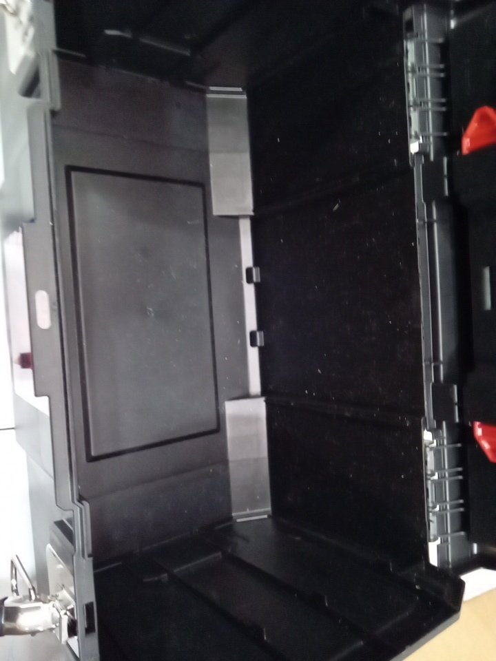 appears that the top handle has been broken off, there is some dust and debris on the interior or the tool tox. wheels have some dirt on the (see photos)