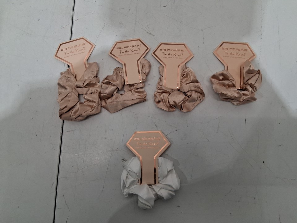 5PK BRIDESMAID HAIR SCRUNCHIE PROPOSAL GIFT "WILL YOU HELP ME TIE THE KNOT? - Champagne/white