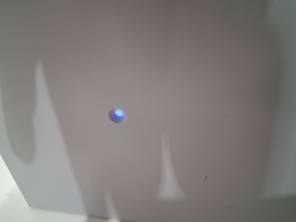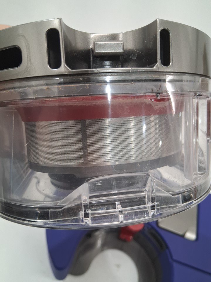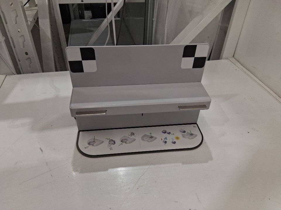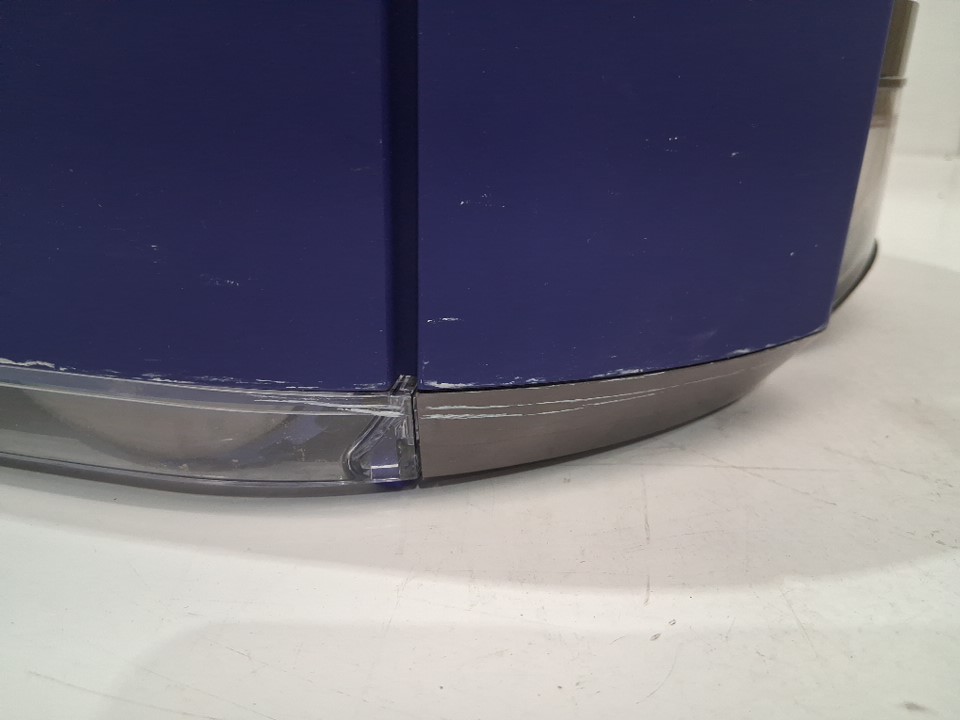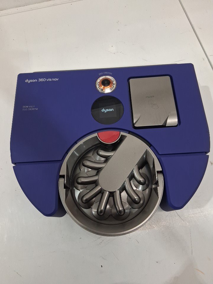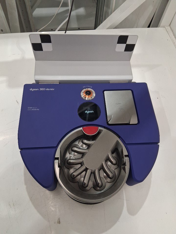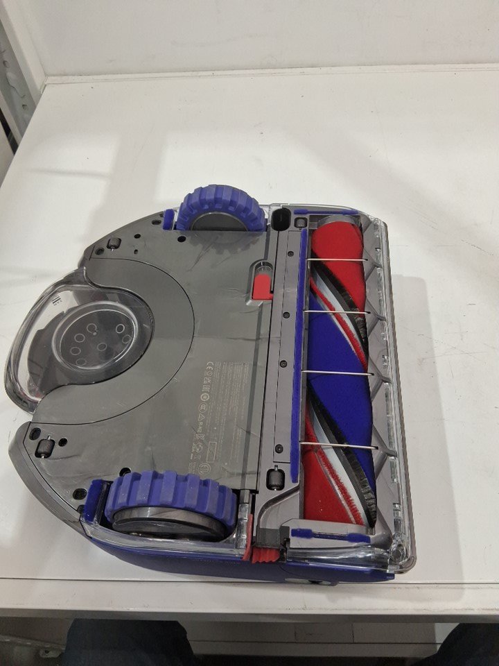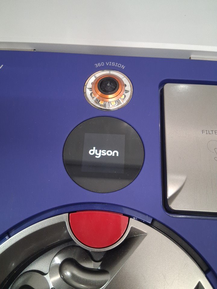 Robot does not appear able to power on or charge. The light on the back of the charging dock turns blue when plugged in indicating that power is running, but when the robot is placed on the dock the light turns off. The screen on the robot continued to show only the dyson logo with no changes, and it could not be detected by the MyDyson app in this state. There is some light dust in the tank and around the machine as well as some scuffs, indicating some prior use, but there is no visible physical damage to any parts - see photos.