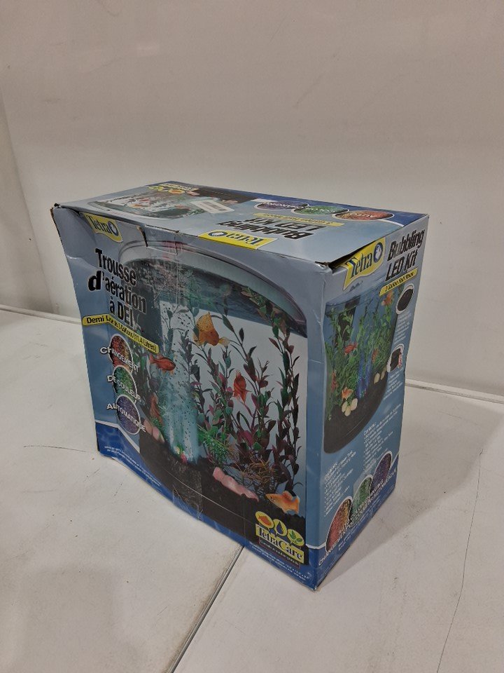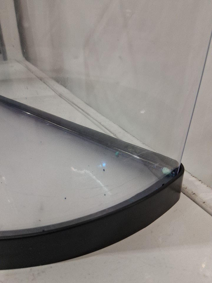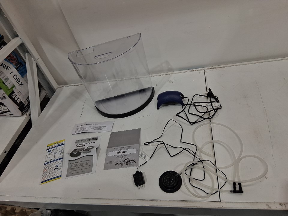 Missing filter and filter cartridges. Water droplets, light scratches, and leftover aquarium gravel indicate previous use (See photos).