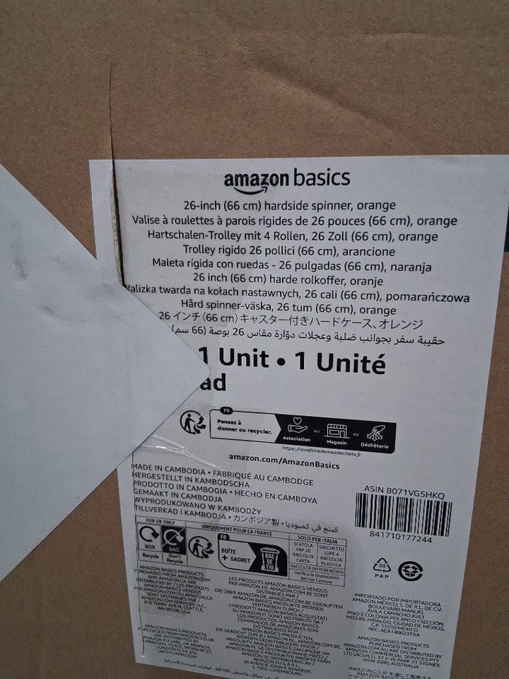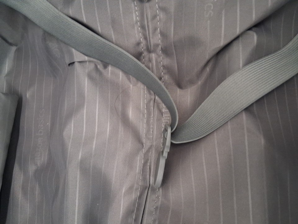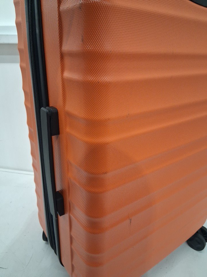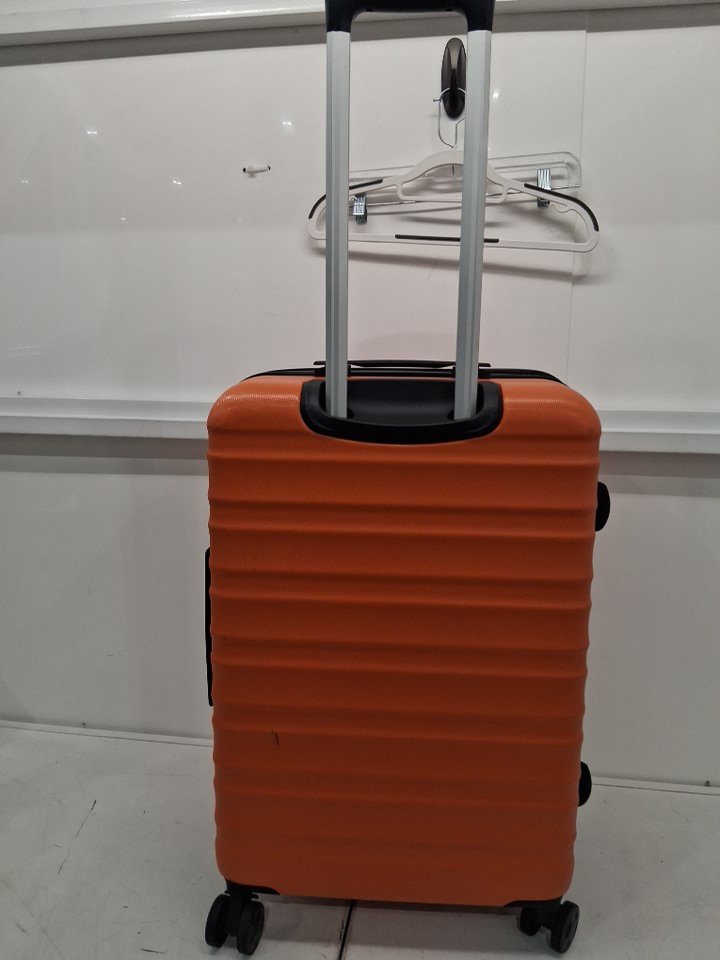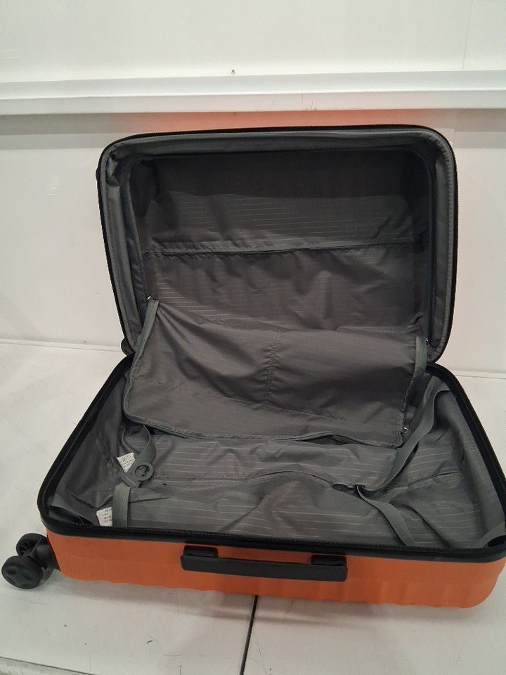 Suitcase wheels have light dirt discoloration, has black scuff marks on outside and loose hair on the inside