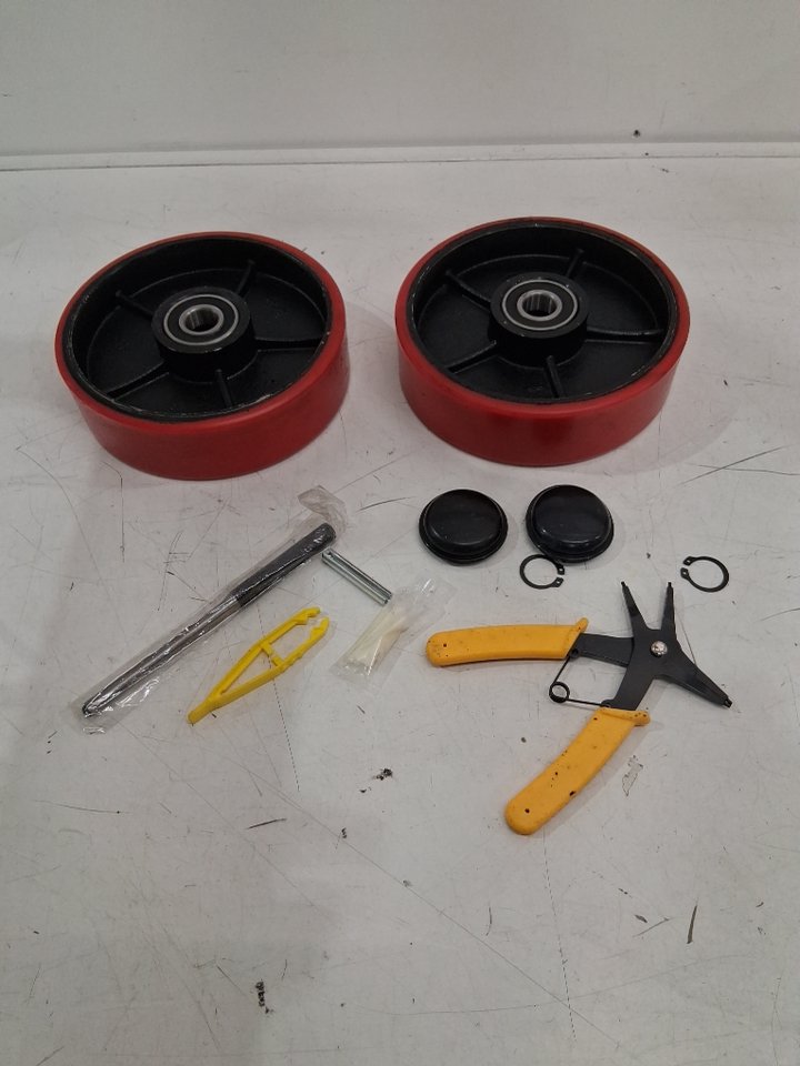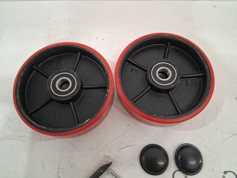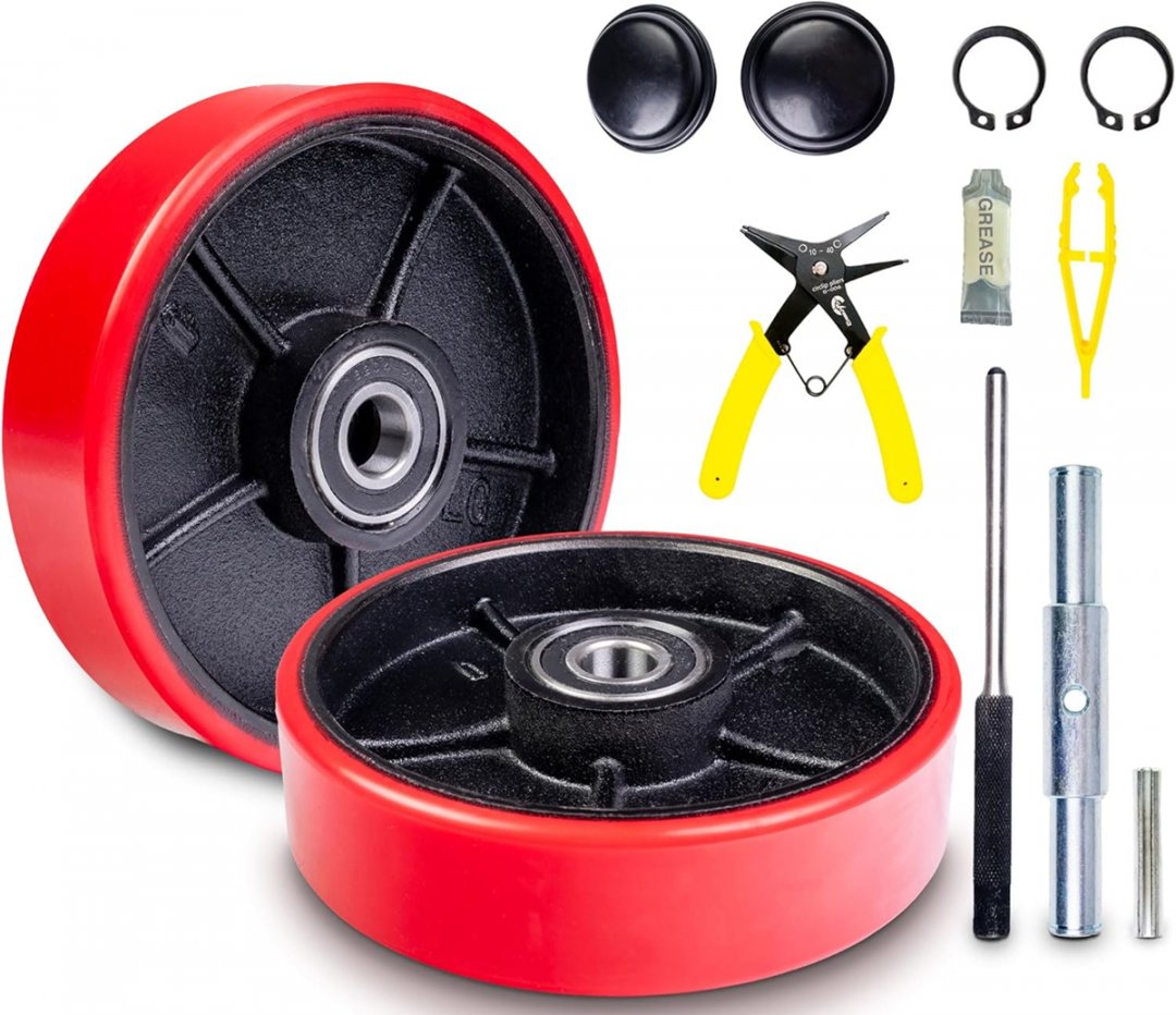 Carbo Glide Pallet Jack Steering Wheels Replacement Set With Fasteners and Protective Caps - 7" x 2" - Black/Red (Model: ‎PR-72-C-AB)