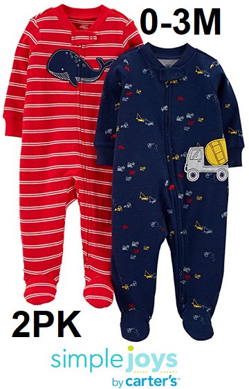 2PK INFANT BOYS' SIMPLE JOYS BY CARTER'S 2-WAY ZIP COTTON FOOTED SLEEP & PLAY PAJAMAS - 0-3M - RED WHALE/CONSTRUCTION