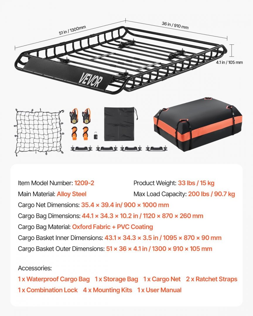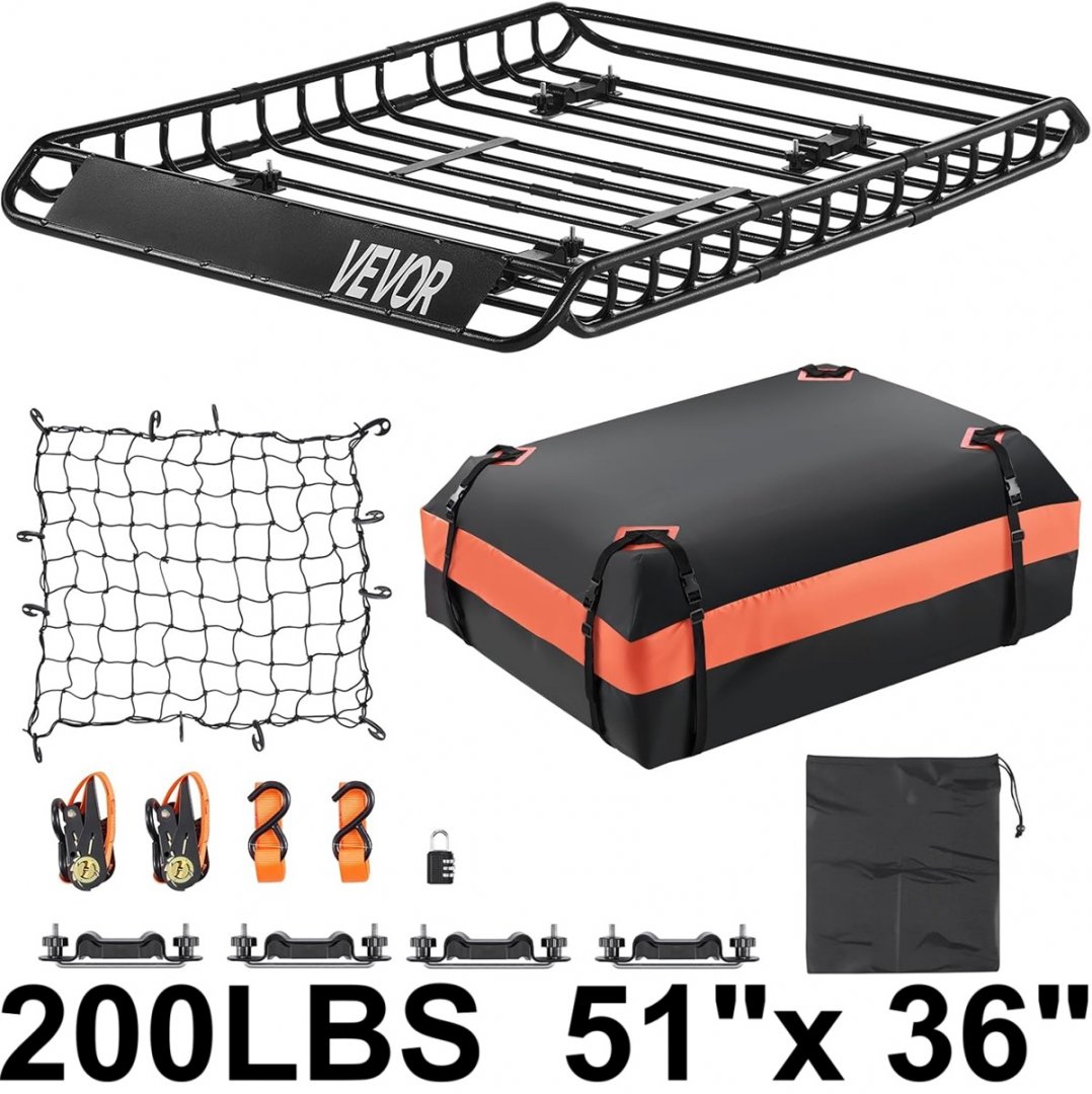 VEVOR Roof Rack Cargo Basket - Heavy-duty 200 LBS Capacity Universal Roof Rack Basket - 51" x 36" - BLACK - (model: 1209-2)