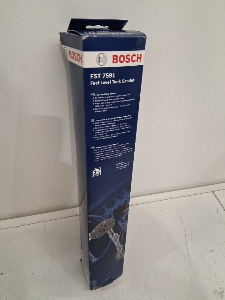 BOSCH FUEL LEVEL SENDER - FOR FUEL LEVEL GAUGES & 5"-26" DEEP TANKS - RESISTANCE: EMPTY= 240 OHMS, HALF= 130 OHMS, FULL= 33 OHMS - Silver (MODEL: FST 7591)