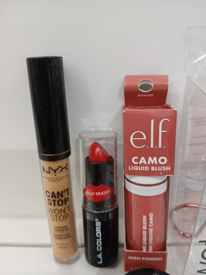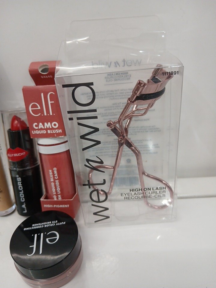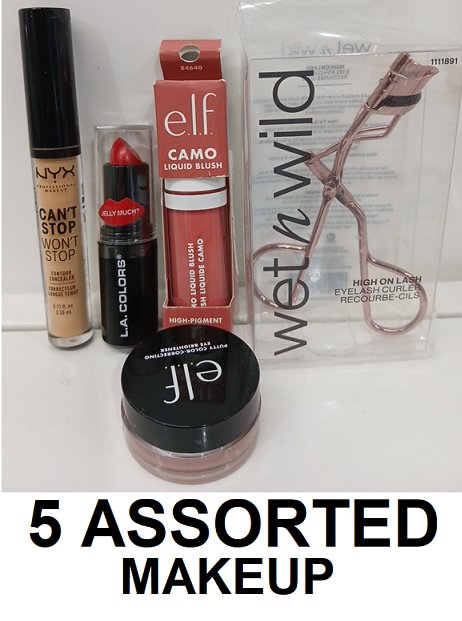 5 assorted makeup - ASSORTED COLORS, TYPES AND BRANDS - blush/ corrector/ eye brightener/ eyelash curler/ lipstick