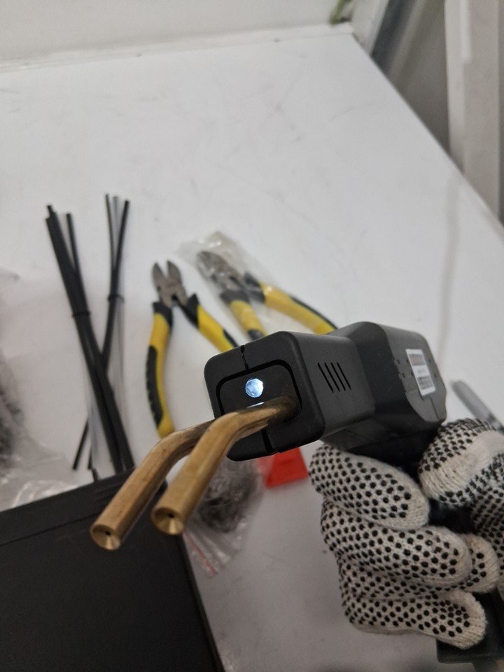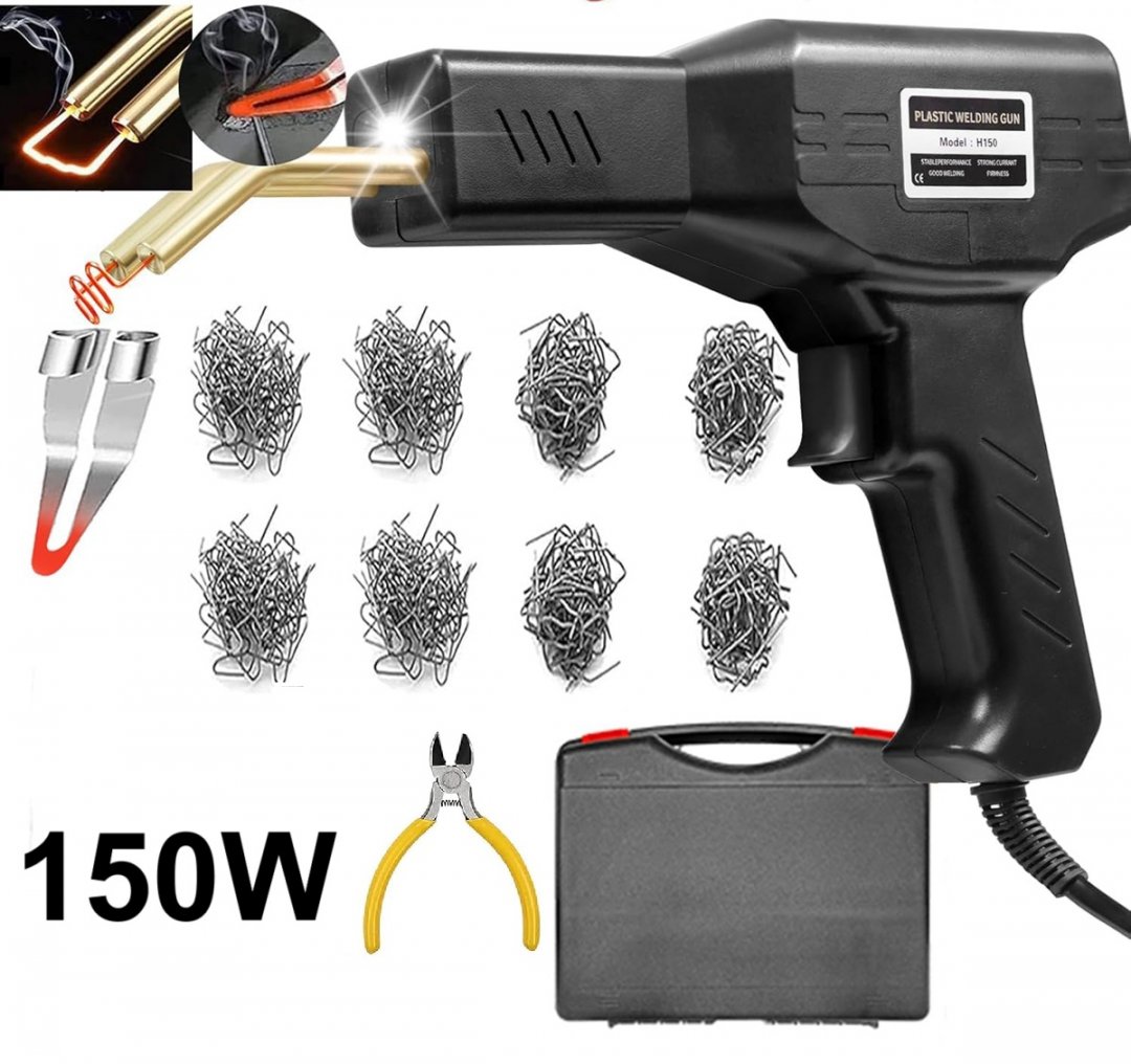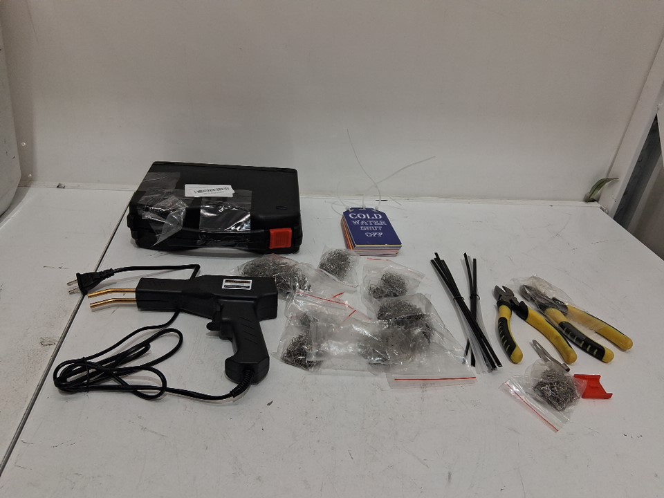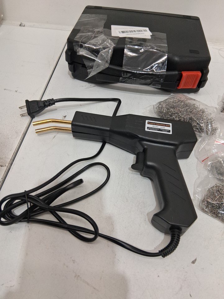 Tested for power. Discoloration from heat on the ends and signs of use on the pliers from previous use. (See photos) Some rods/staples missing/used previously. The latches of the case are broken.