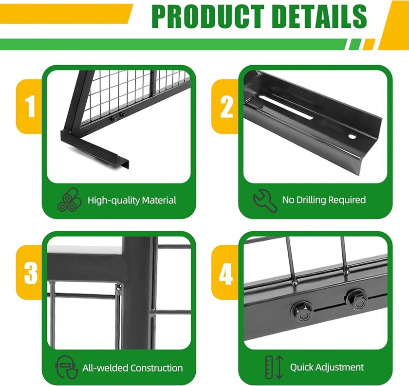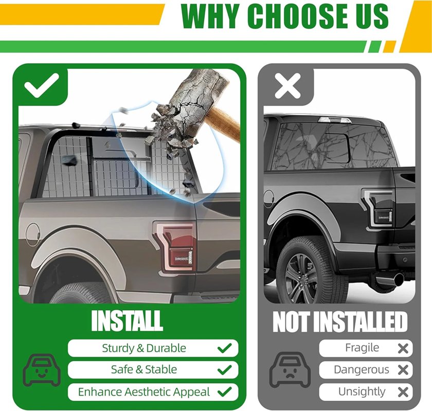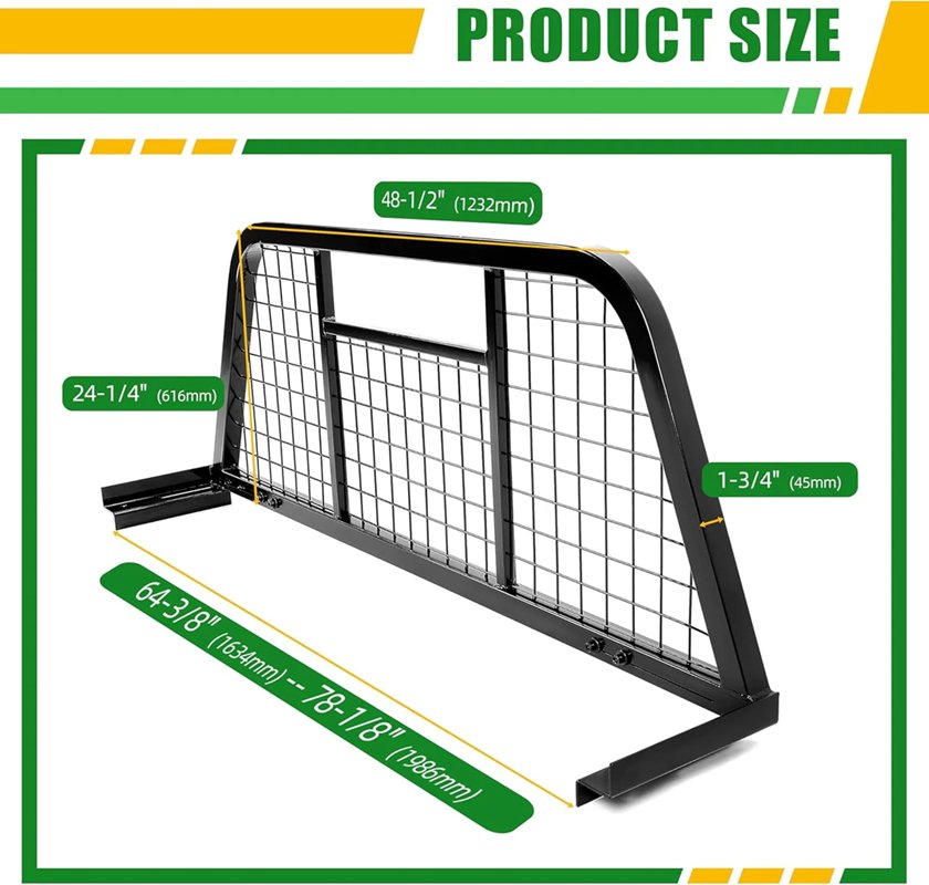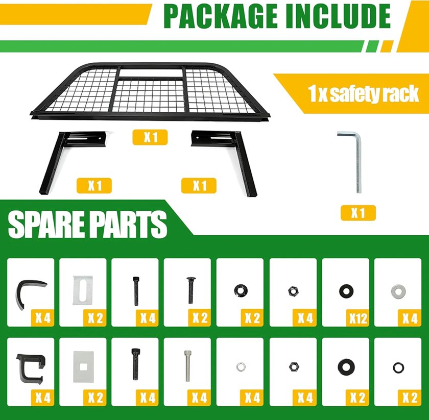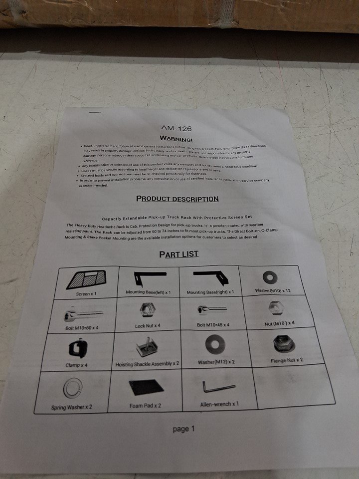 There is no installation hardware for this truck rack, only the rack, the brackets and the manual. One corner has been bent in shipping and there are light marks on the exterior. See photos for closeup of areas of concern.