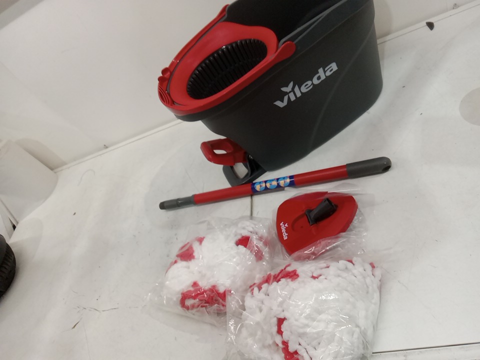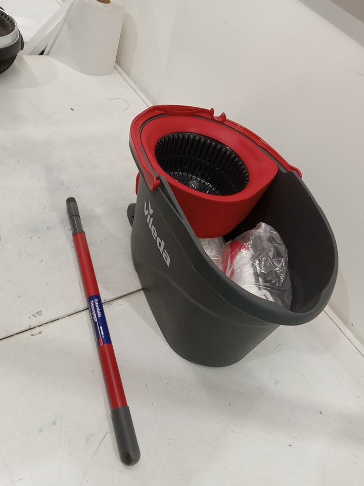 VILEDA EASYWRING POWER SPIN BUCKET SYSTEM WITH EXTENDABLE POLE and 2 mop heads- 22" - 48" - GREY/RED - (MODEL: 172880)