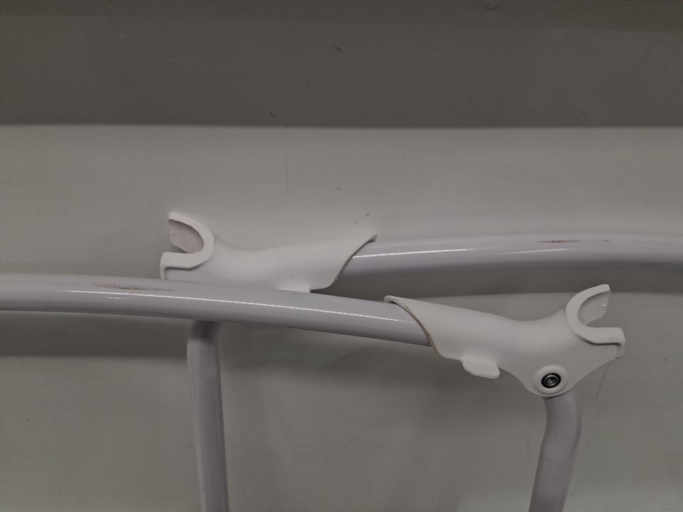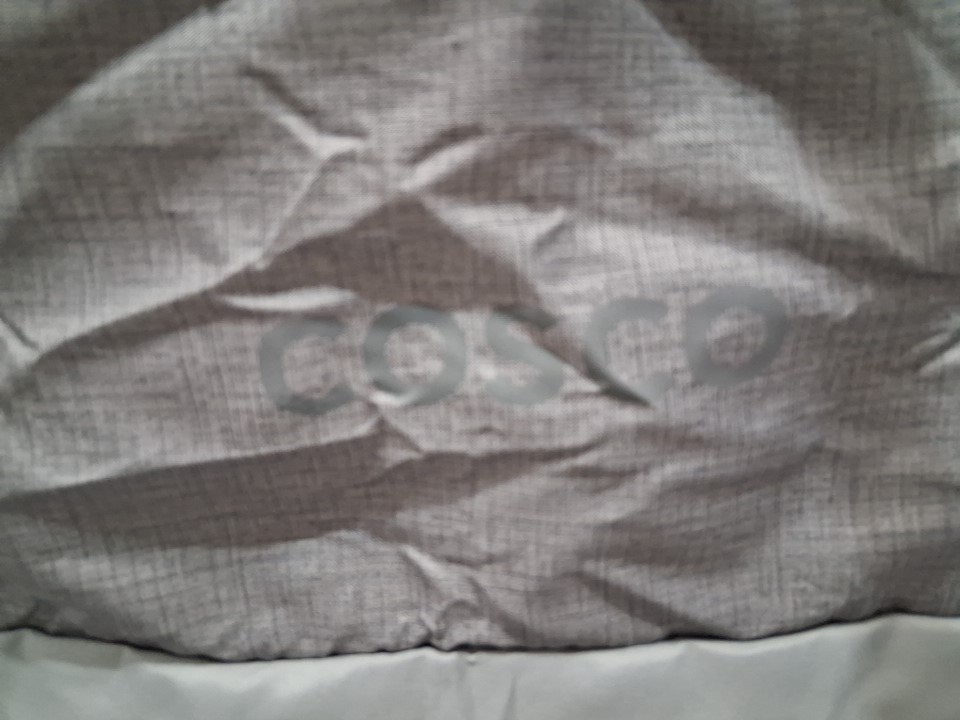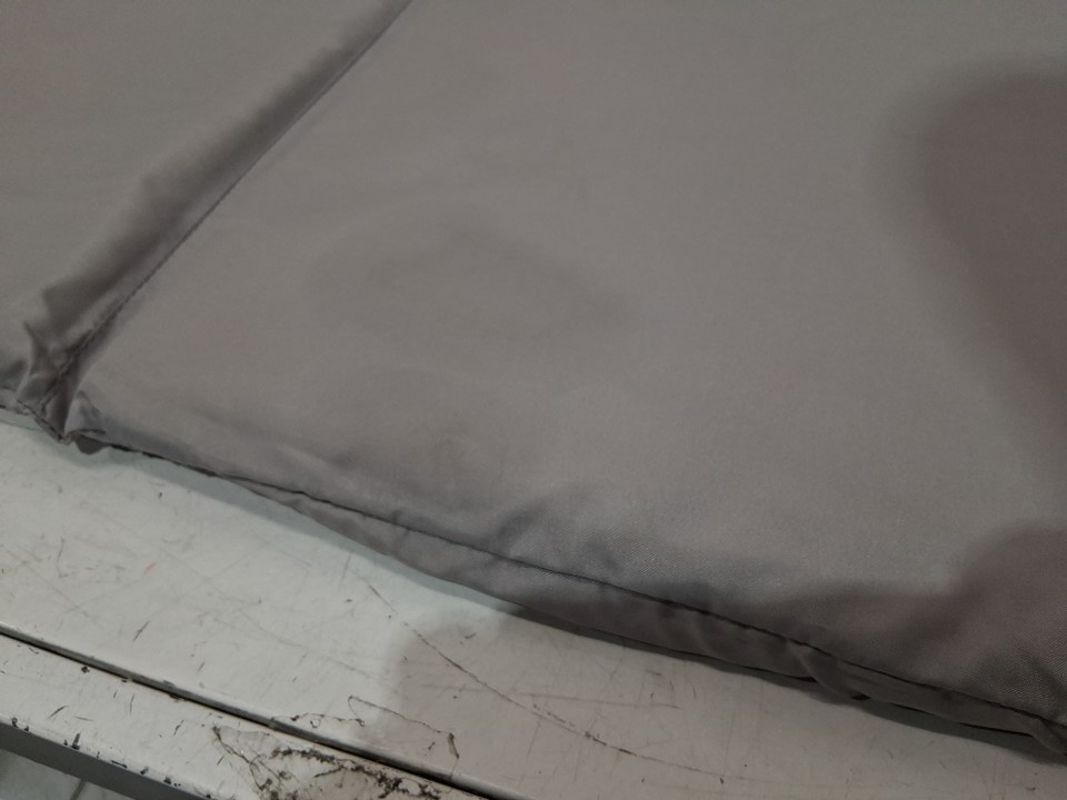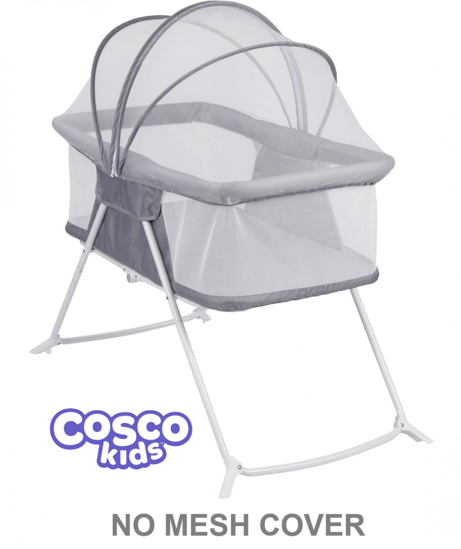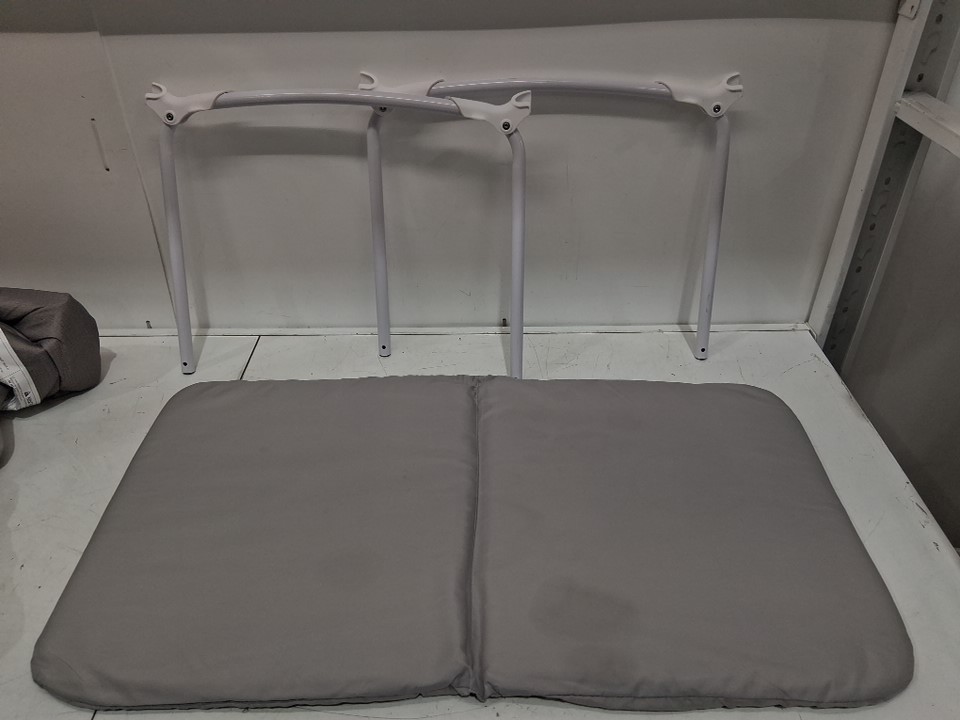 Is missing the top mesh cover. It has been used and bears small marks on the legs and a light stain on the mat. See photos for closeups on all of these.