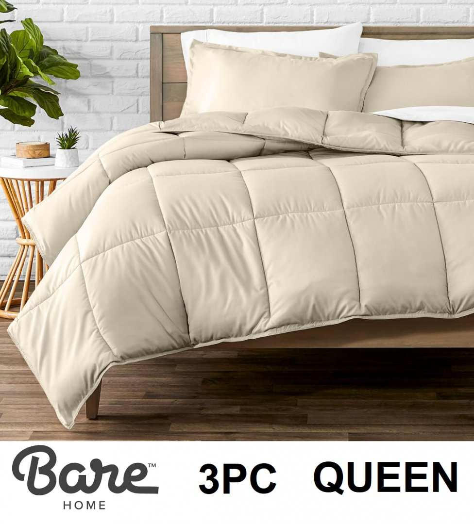 3PC BARE HOME MICROFIBER COMFORTER SET - GOOSE DOWN ALTERNATIVE ULTRA SOFT COMFORTER AND PILLOW SHAMS - QUEEN - Cream