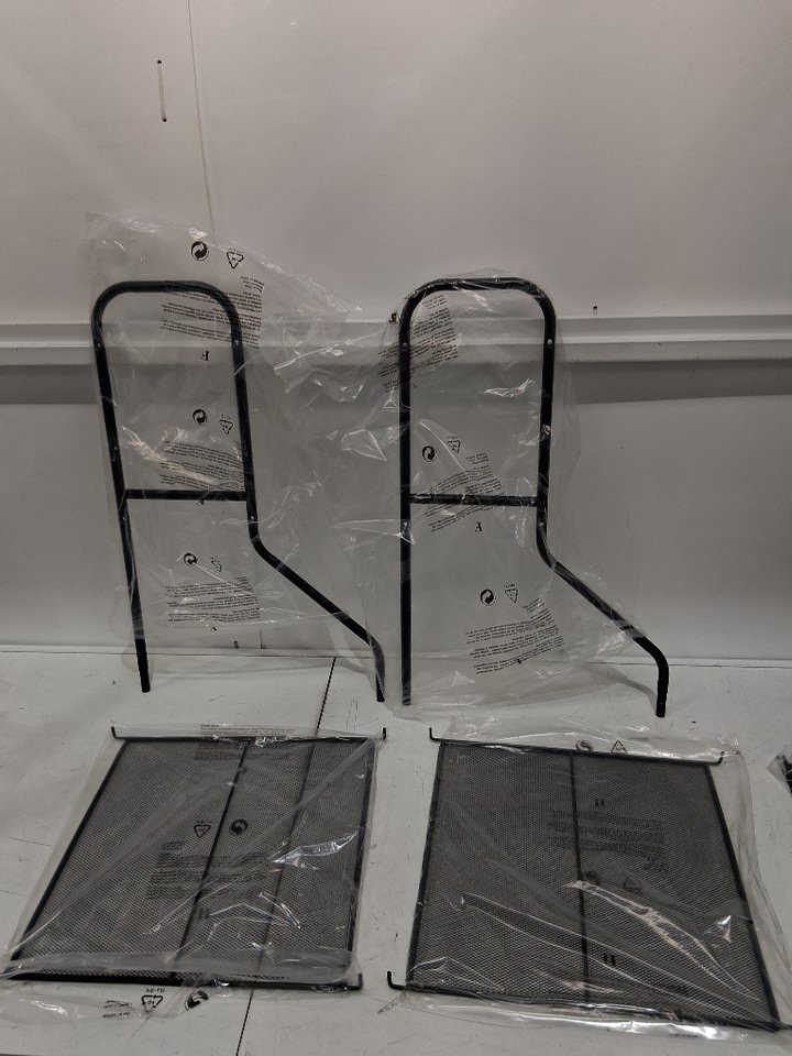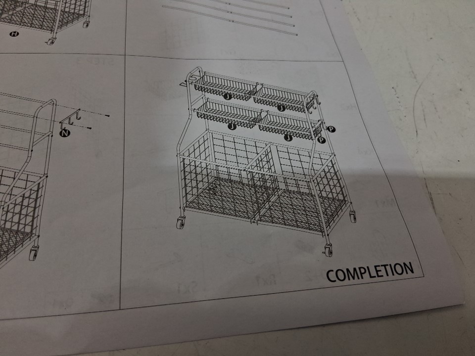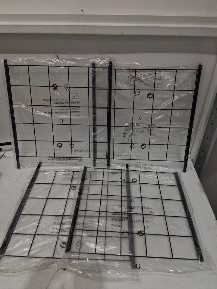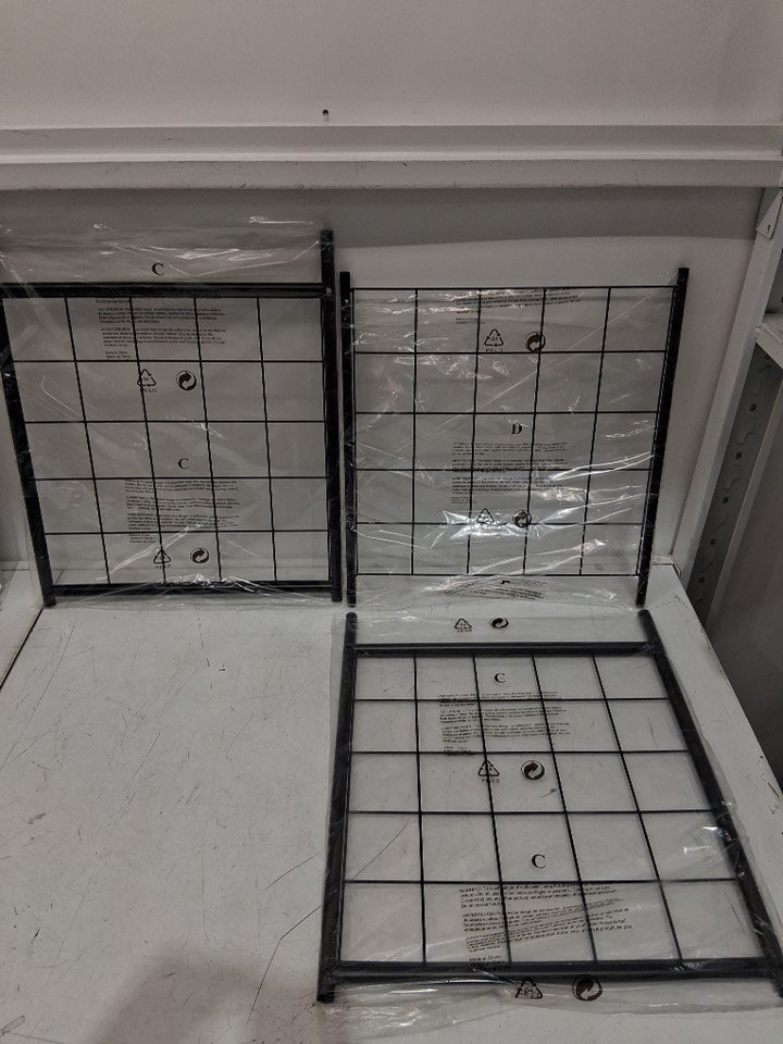 One wire panel is dented from shipping but stays attached and functional, see photos for a closer look. All pieces accounted for by staff.