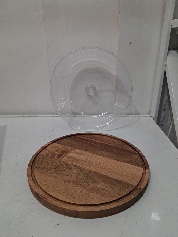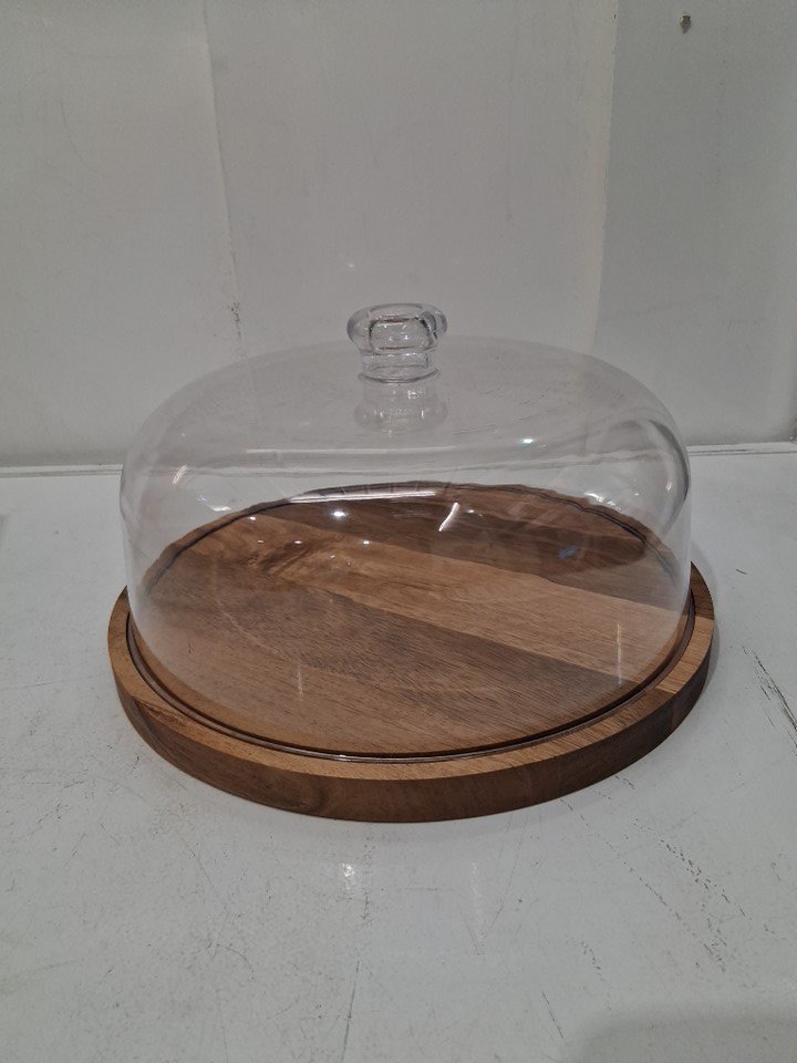 Bread & Cake Serving Plate Display Stand with Plastic Dome - 11.6" x 11.6" x 6" - Wood/Clear
