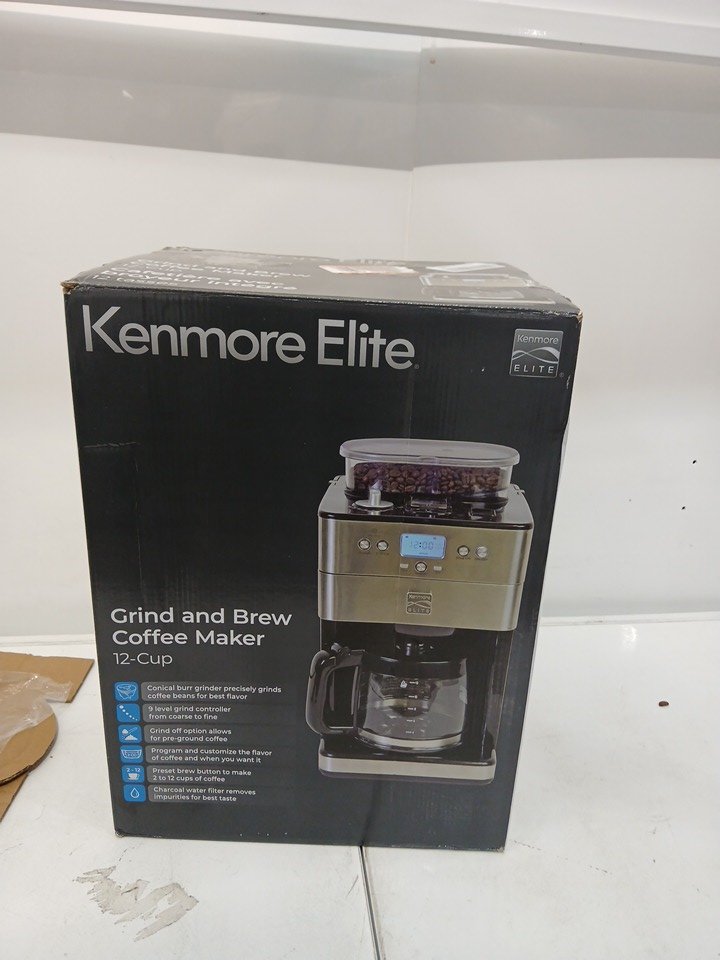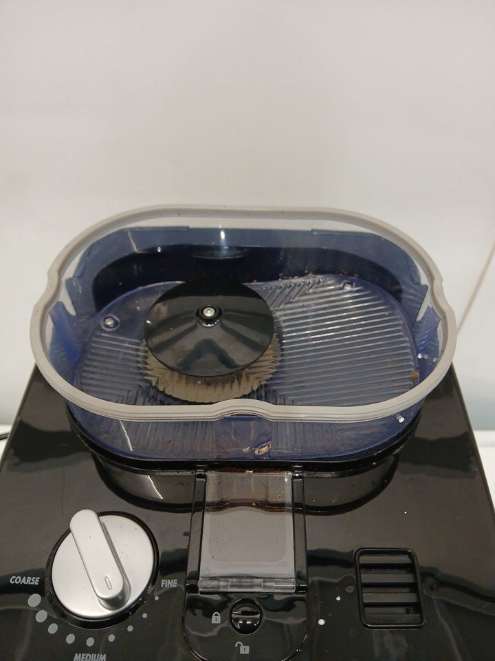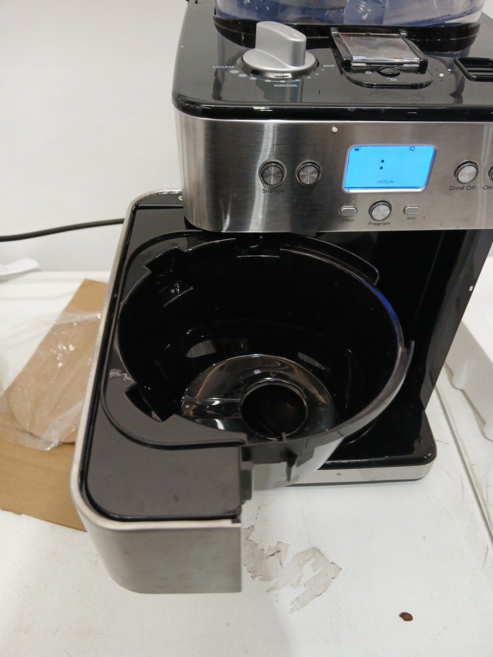 Please note all accessories, such as the pot and burr grinder lid, are not included in the package. This is only the coffee machine by itself. Please also note there is a minor presence of coffee residue, indicating prior use.