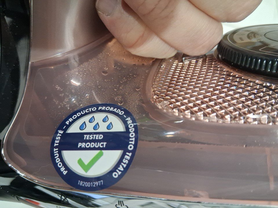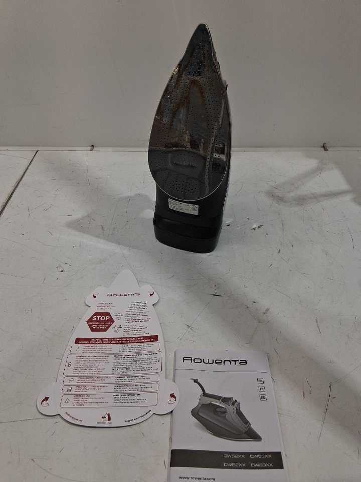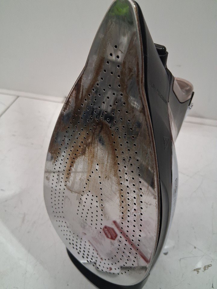 product has a large burn mark on the bottom surface of the iron. Product also has been used because there is water inside the water tank Product was tested for power