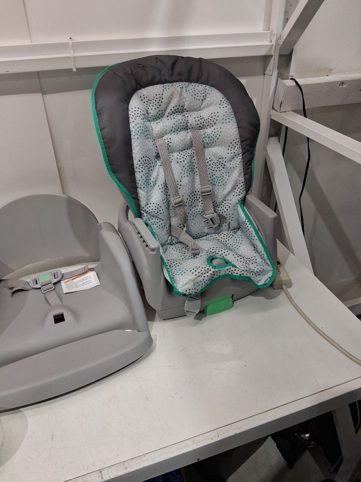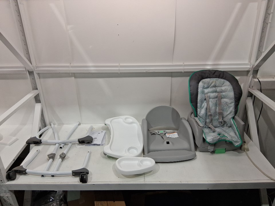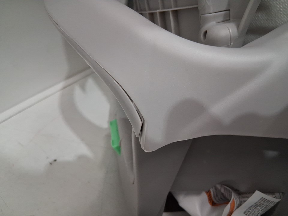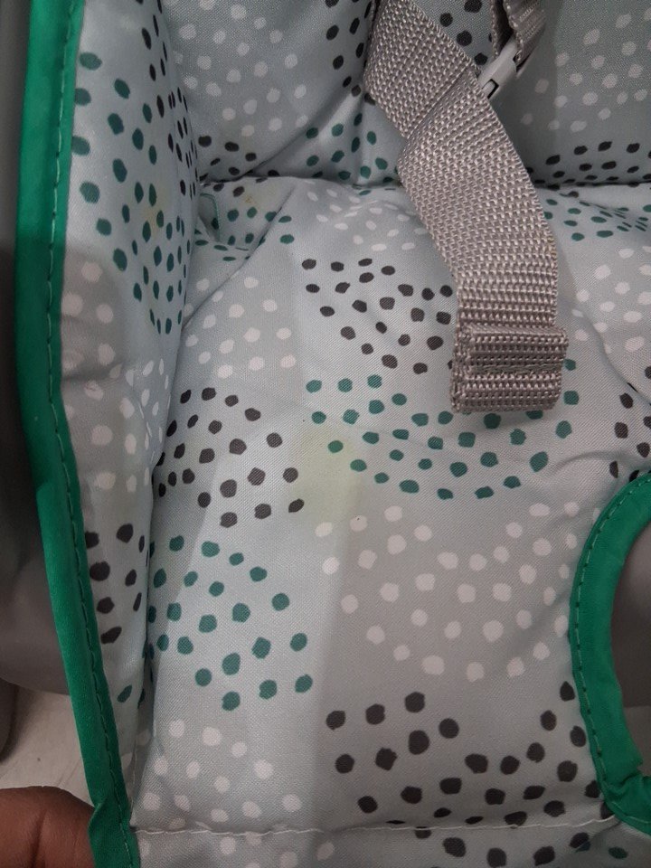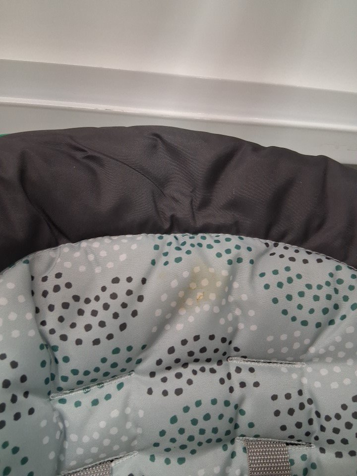 stains on the chair cover, some damage to the plastic (white marks on plastic) and scratching on the legs / frame of the item all indicating prior use