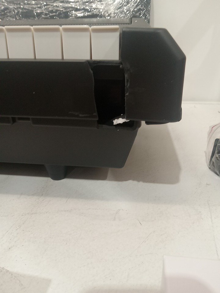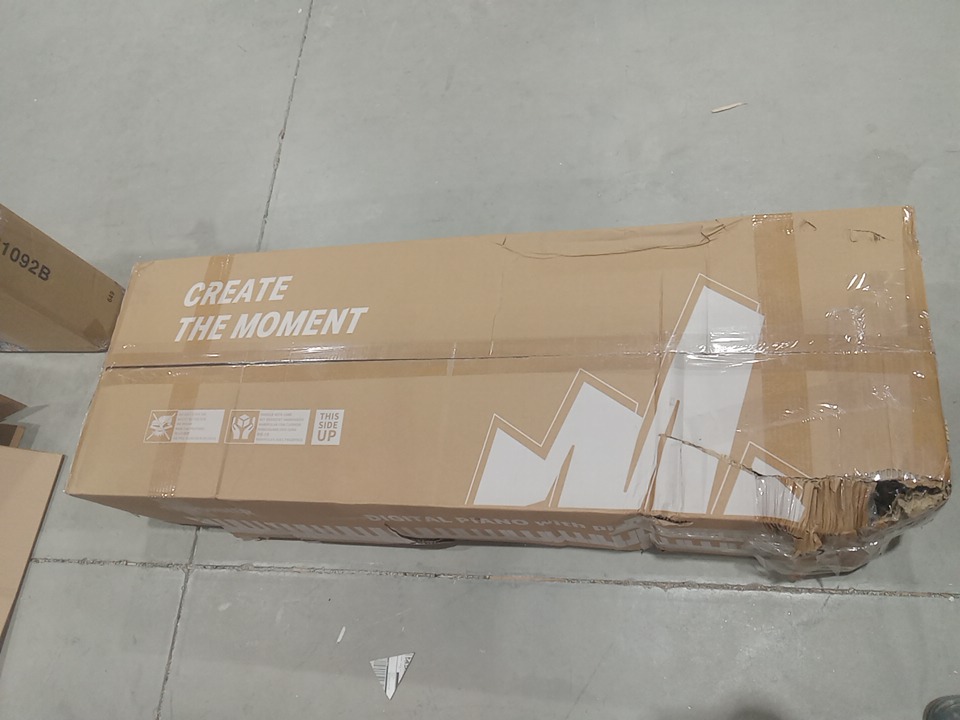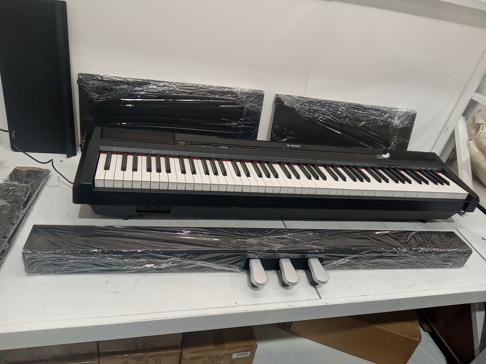 Upon inspection we have found that the plastic body for the piano has a hole / crack on it and one of the wood board pieces for the wooden stand is split / broken and will be unusable, this may effect the structural integrity and assembly of the stand making it unusable, however the piano itself has been tested and is confirmed to be working without issue. connector cables for the piano to the pedals is missing meaning a separate cable will need to be acquired separately in order to use the pedals, keep in mind that the usage of the pedals may be effected by the previously stated issues with the stand, as the pedals are connected to the stand as seen in the main image. see photos below.