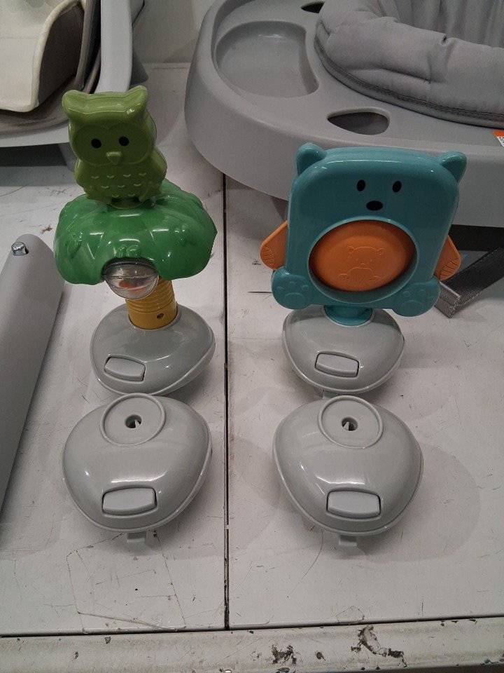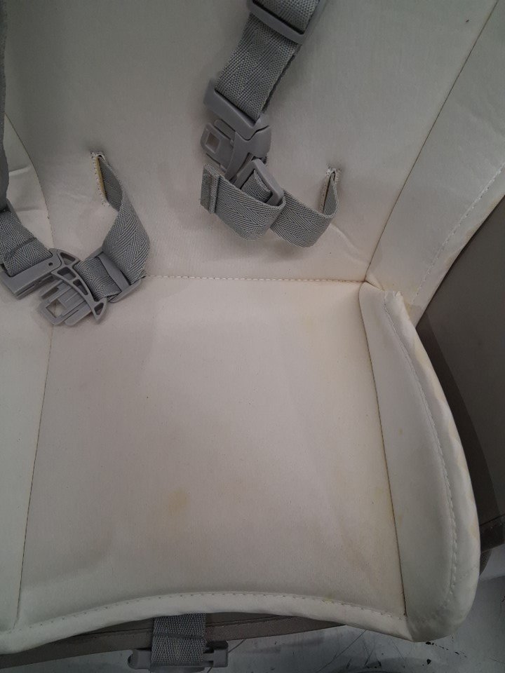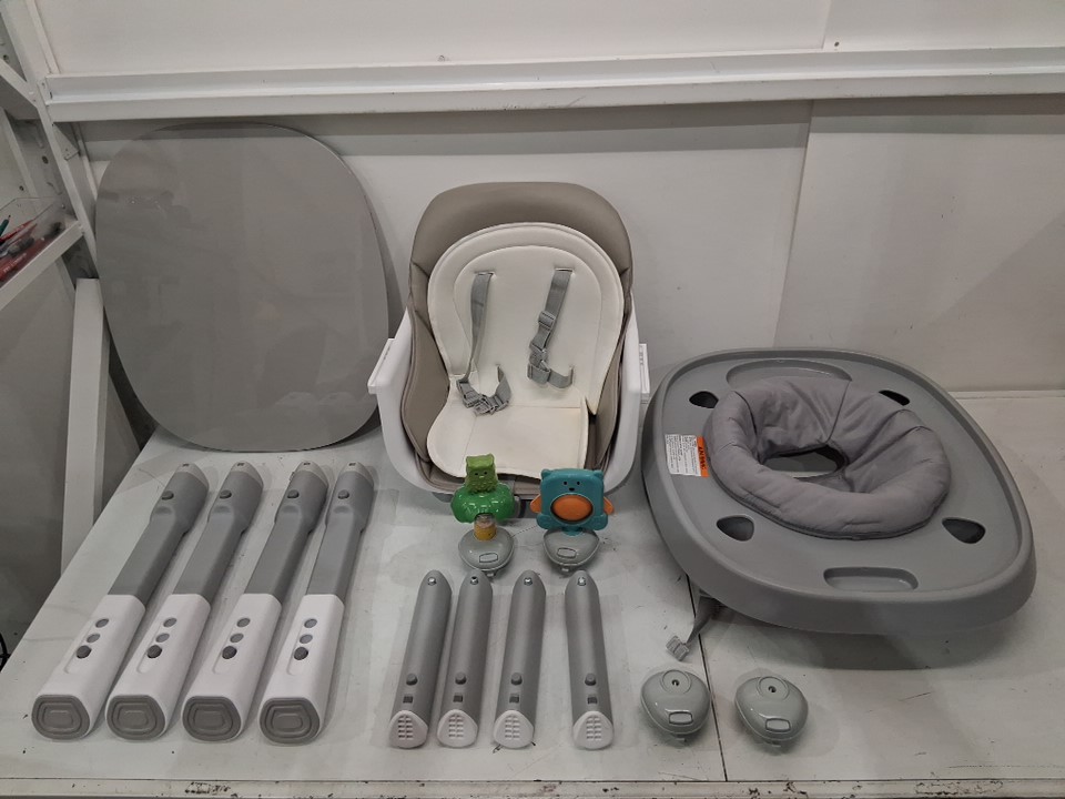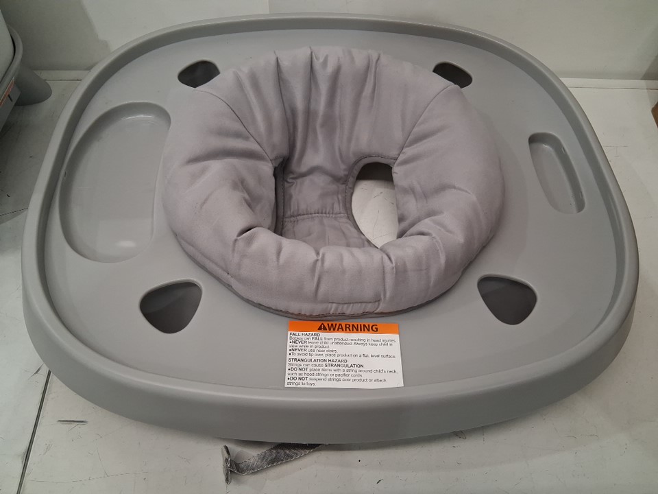 Baby seat has light stains on padding. Unit missing tray and minor hardware. (See photos)