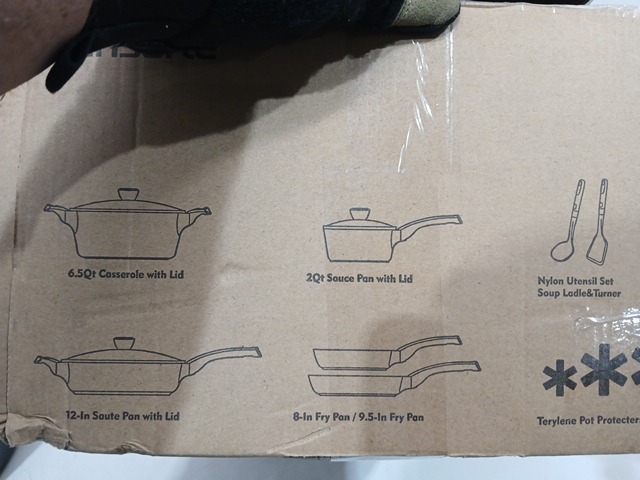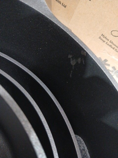 There are scuff marks on some of the sets, and the ladle handle has been broken off.