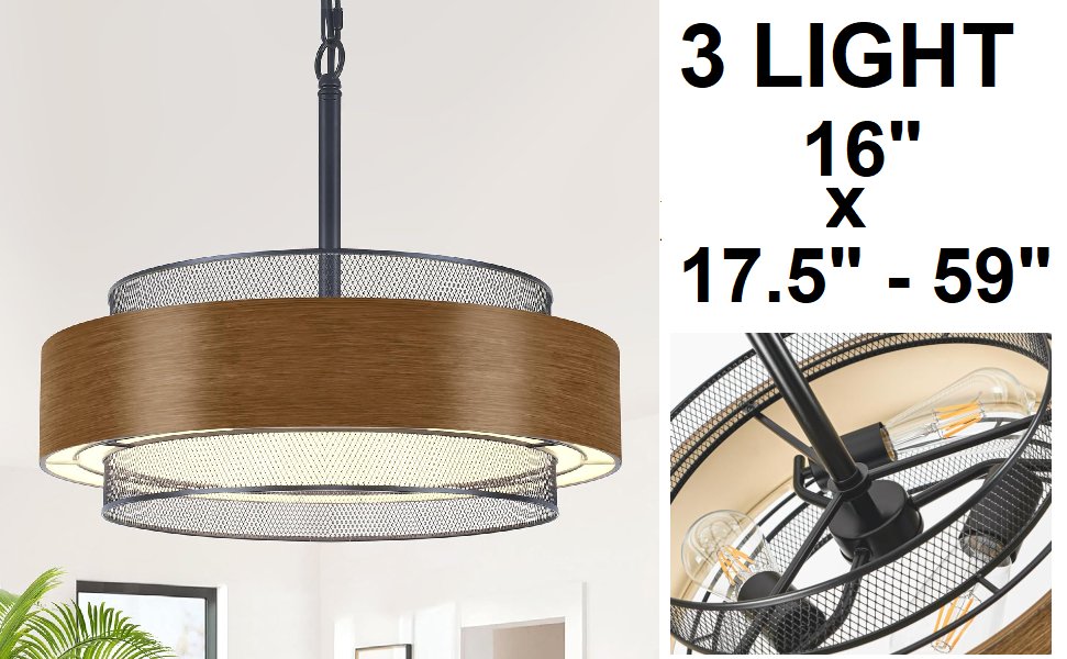 CWarmozy 3 light hardwired Adjustable Farmhouse Chandelier - 16" x 17.5" to 59" - black/brown wood
