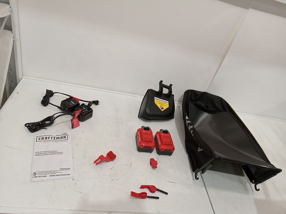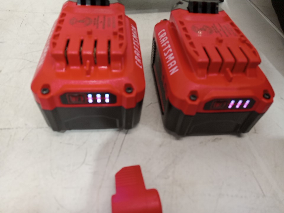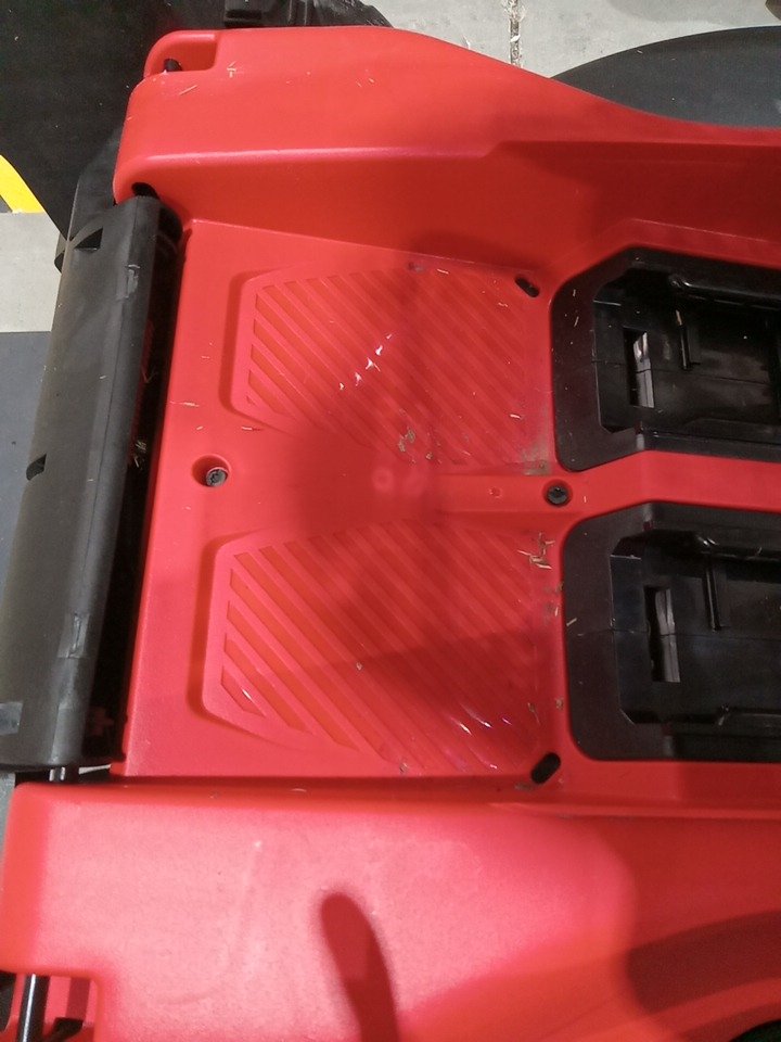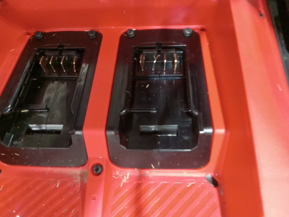 upon inspection, we hve found that their seems to be an issue with the slots for the batteries as they will not clink into place and connect meaning we were unable to test this item for working power, however the batteries themselves have full charge indicating they may be new. their is some grass and lawn matter on this item indicating prior use. see photos below.