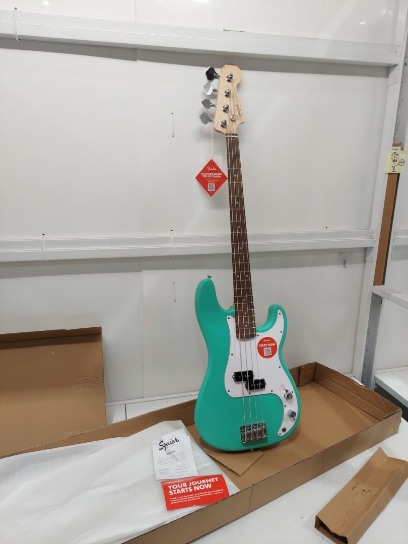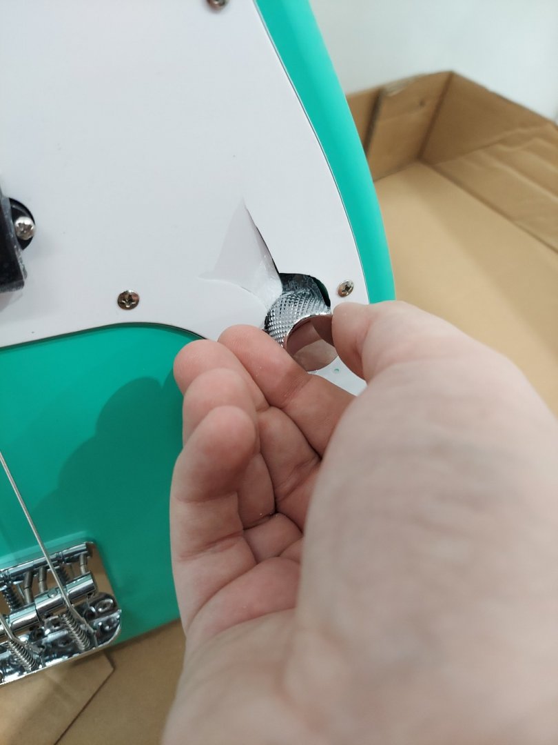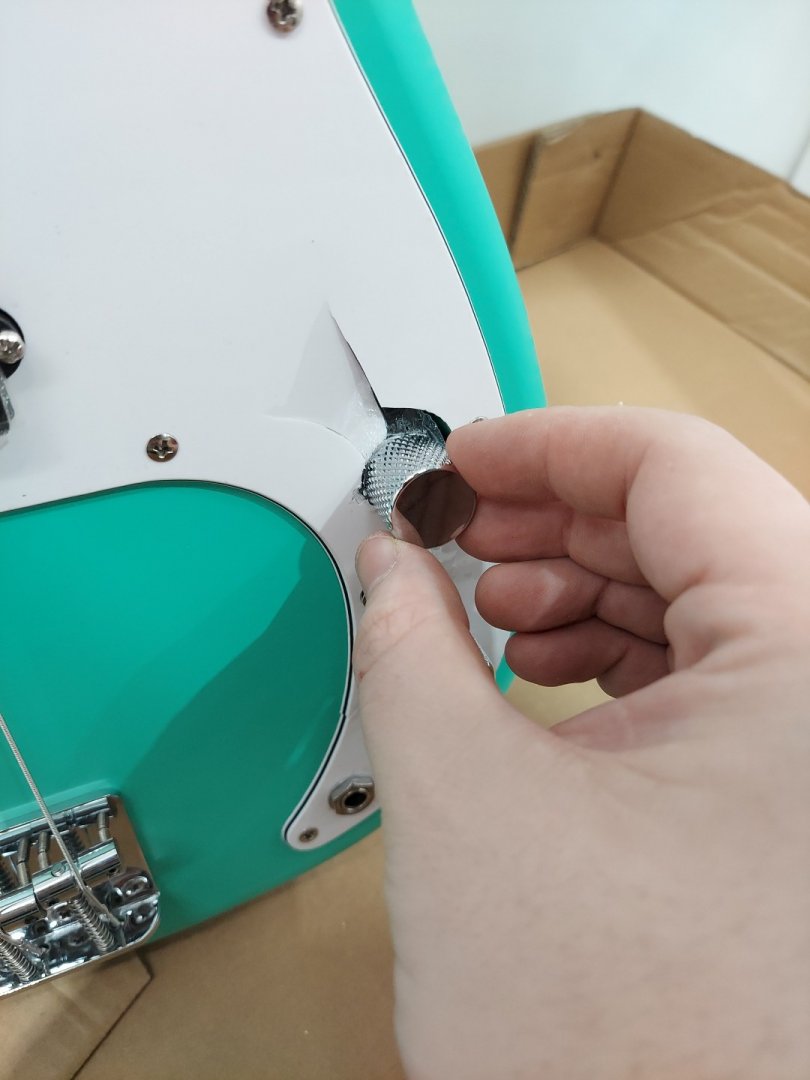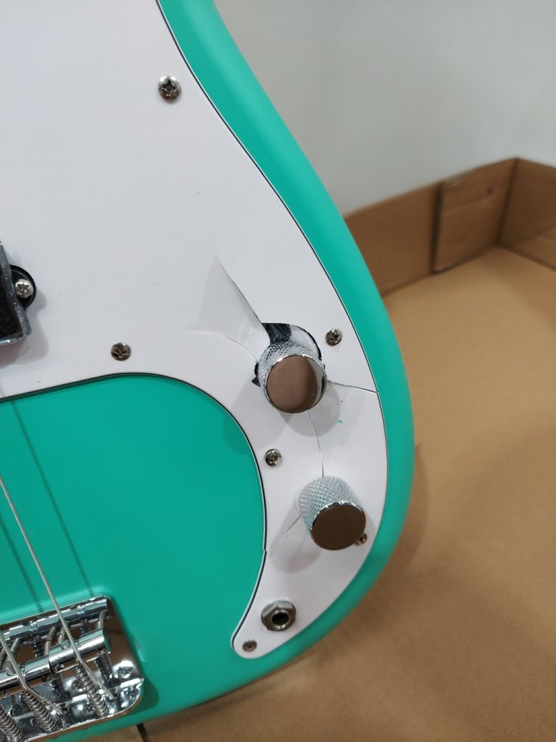 Please note that this item arrived with damage to the 3-ply white pickguard and the knob piece is partially pressed in but the pickguard can be replaced and the knob appears to move normally. the item appears new otherwise. unable to test due to the nature of the item. See photos.