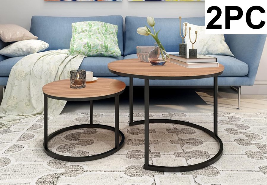 2PC NESTING MODERN COFFEE AND SNACK SIDE TABLES WITH METAL FRAME - 27.5" ROUND - Black/Beach Wood Maple (MODEL: ZZ-807A)