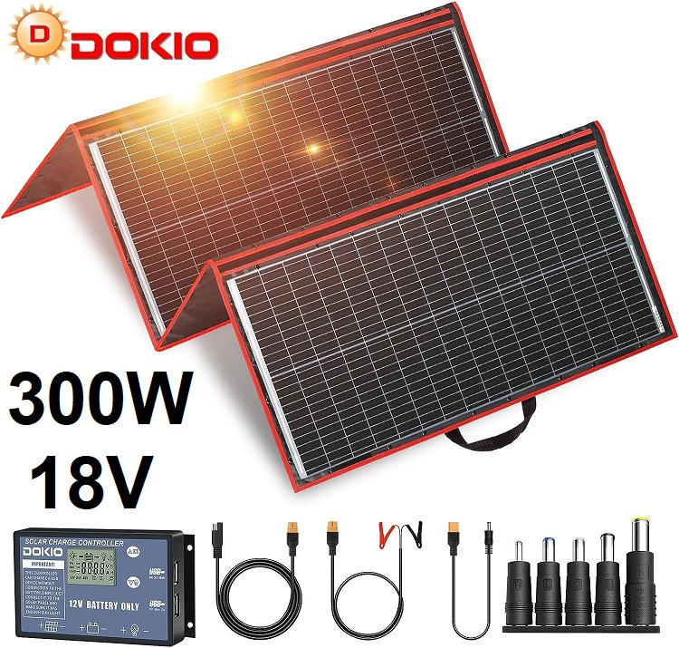 dokio portable folding solar panel kit with 2-USB outputs - 300W, 18V (model: FFSP-320M)