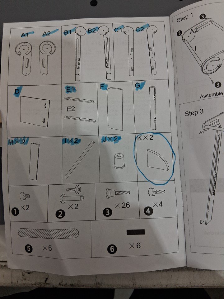 please note: this is missing the leg supports otherwise known as K in the manual. please see photos. this could easily be DIY to ensure the stability. all other parts accounted for.