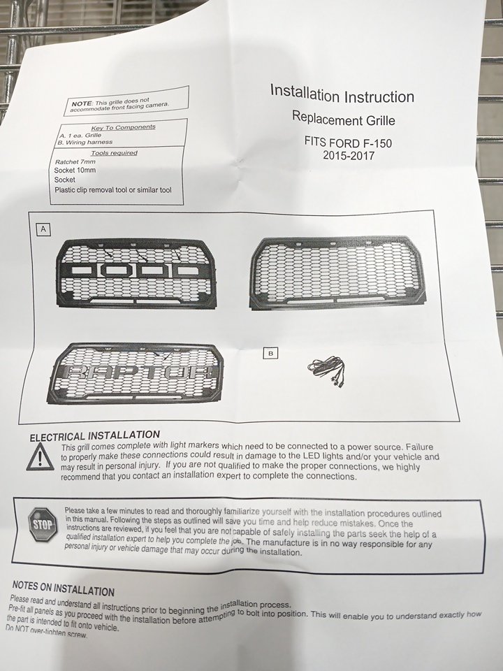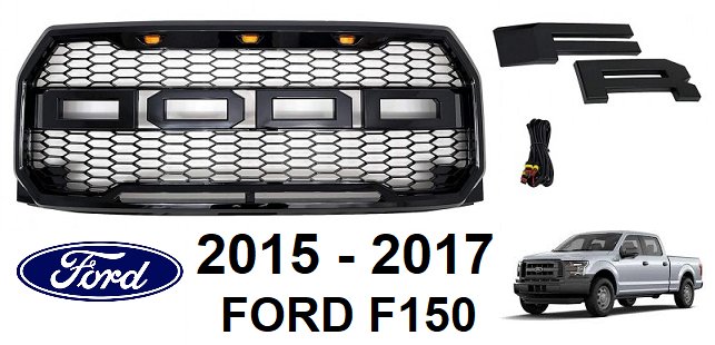 Front Grille Raptor Mesh Style with Three LED Lights - for 2015-17 Ford F150 - Gloss Black (Model: PG-GL11F017)