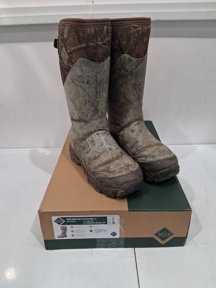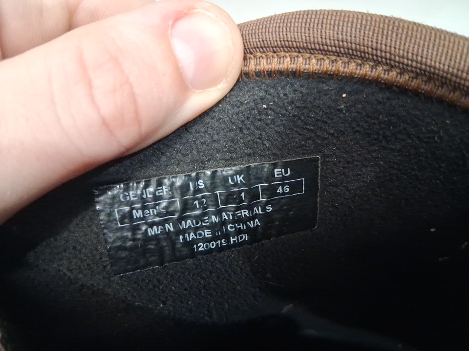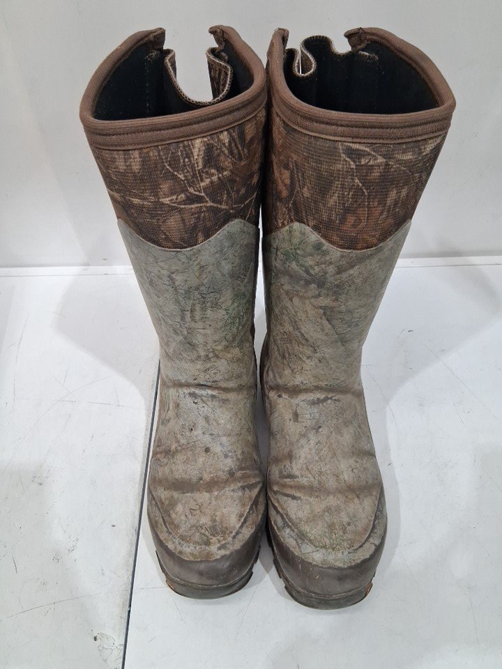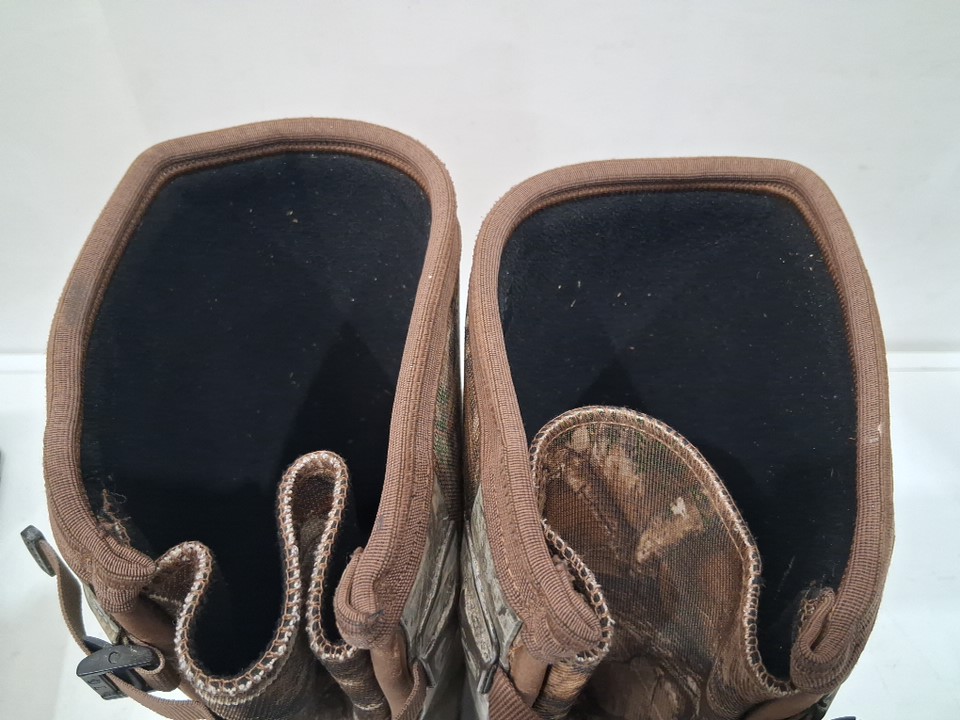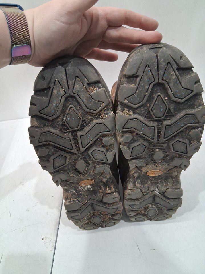 Item shows previous signs of use such as mud/dirt on surface of boot, on soles of boots, and mild hair on inside of boots.