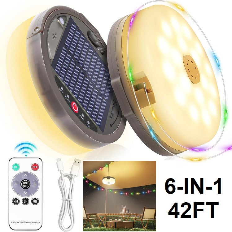 helesin 6-in-1 rechargeable outdoor camping lamp and string light with remote control solar panel and usb charging port - 42ft - green (MODEL: ‎D-TYN-YYD-CS-1PCS)