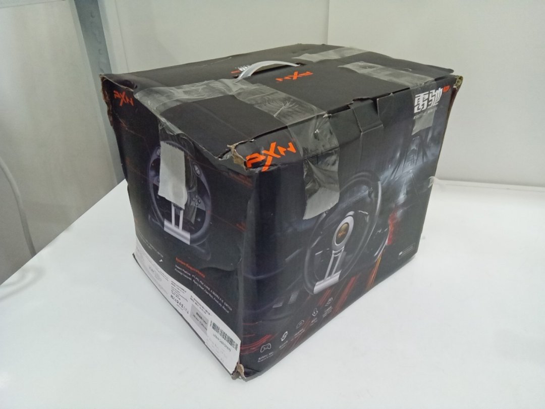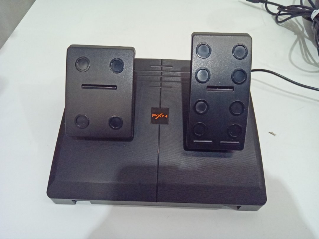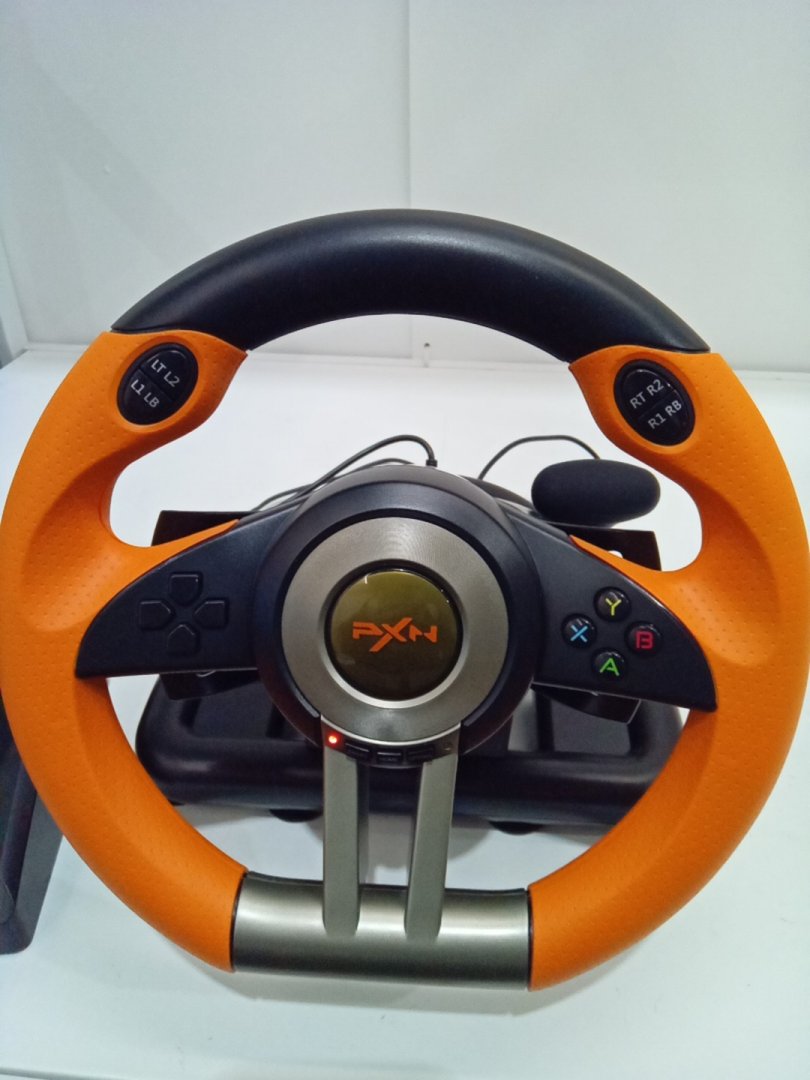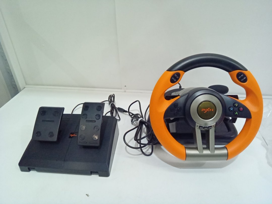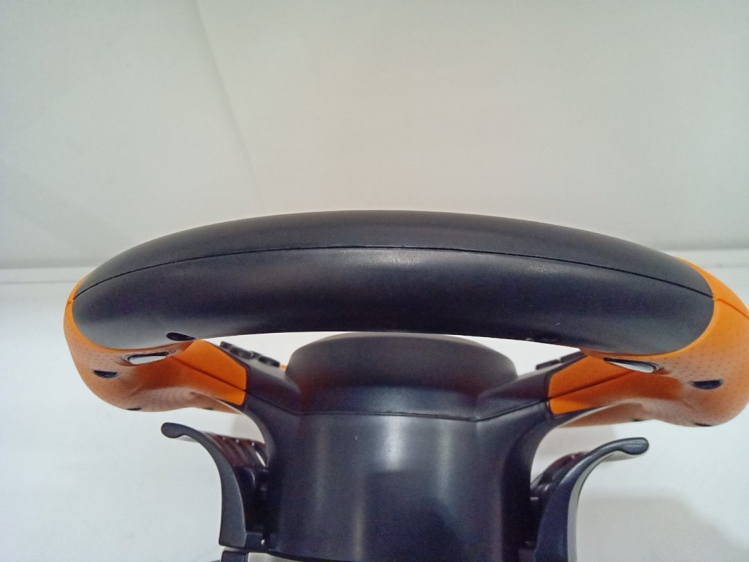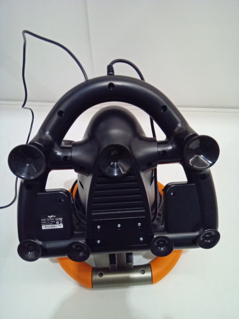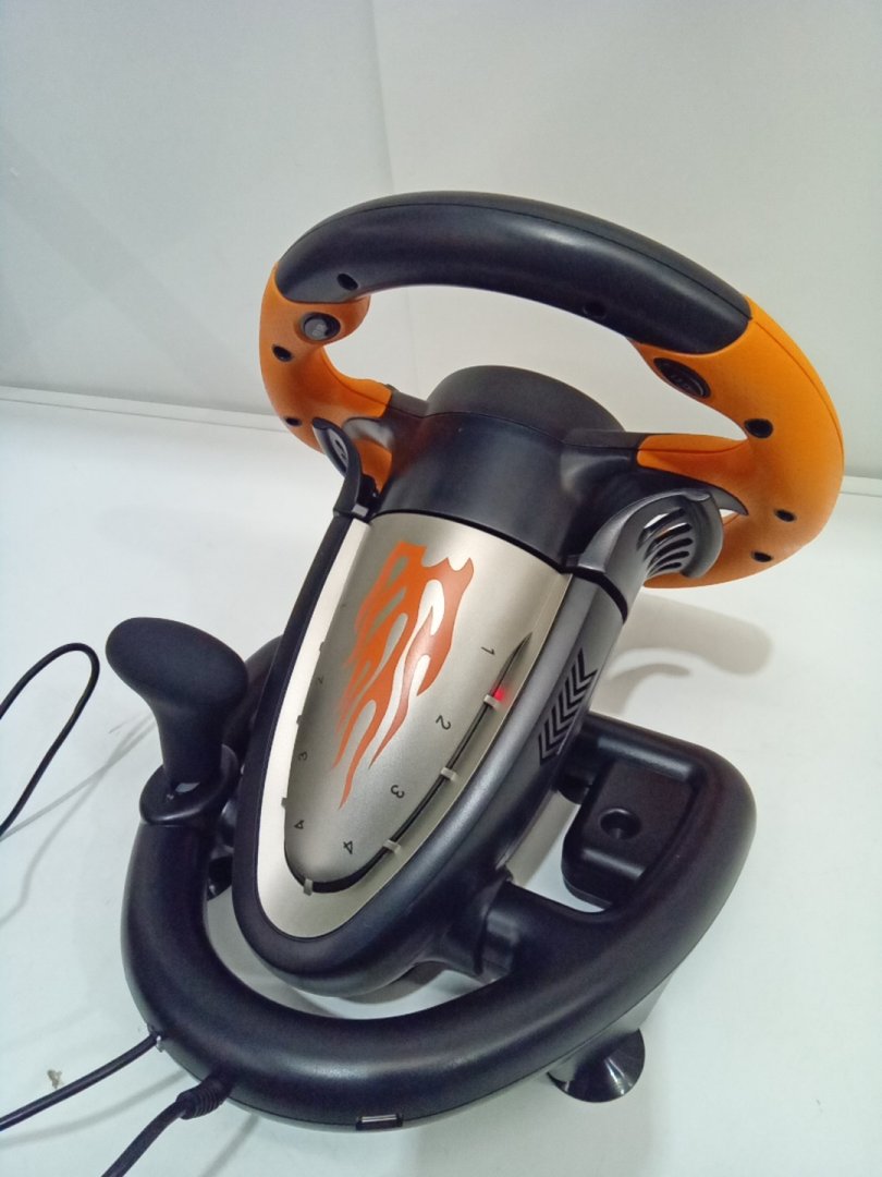 Signs of light wear on steering wheel from prior use. Set is missing desk clamp.