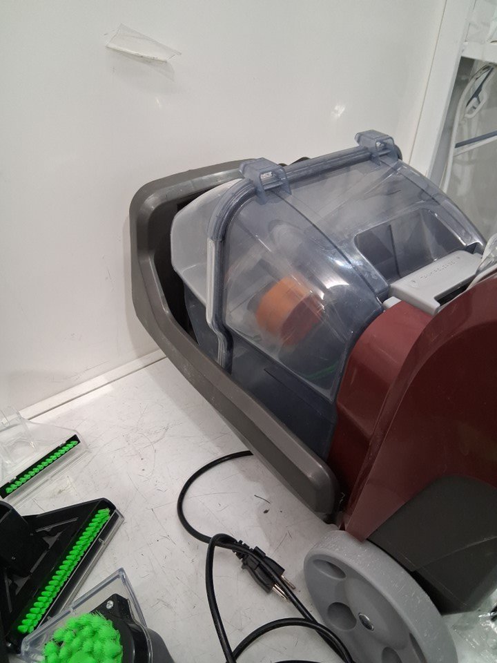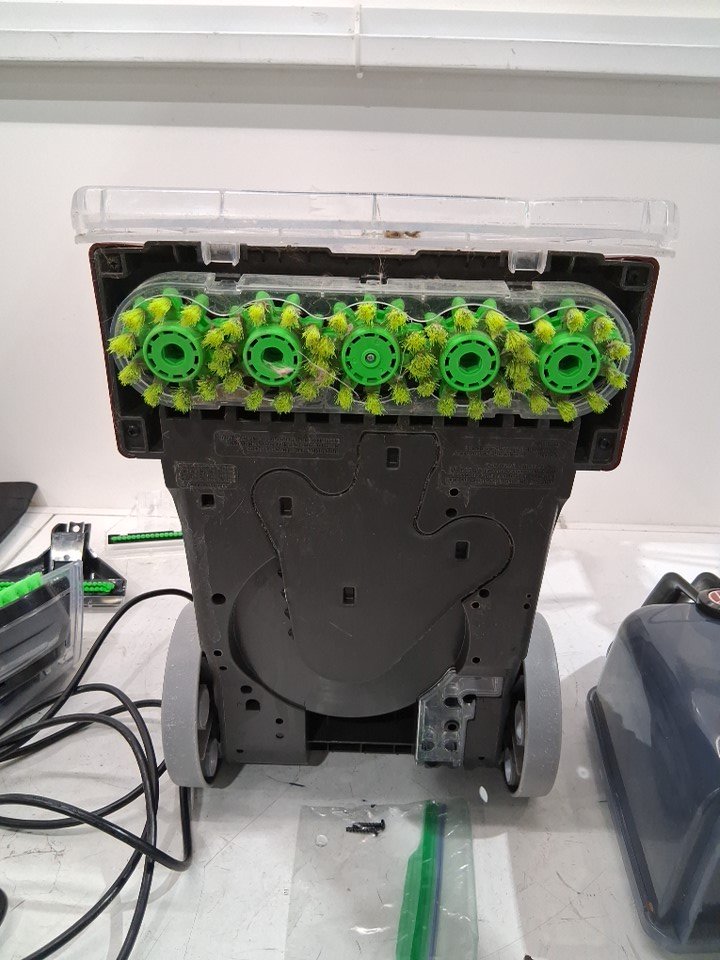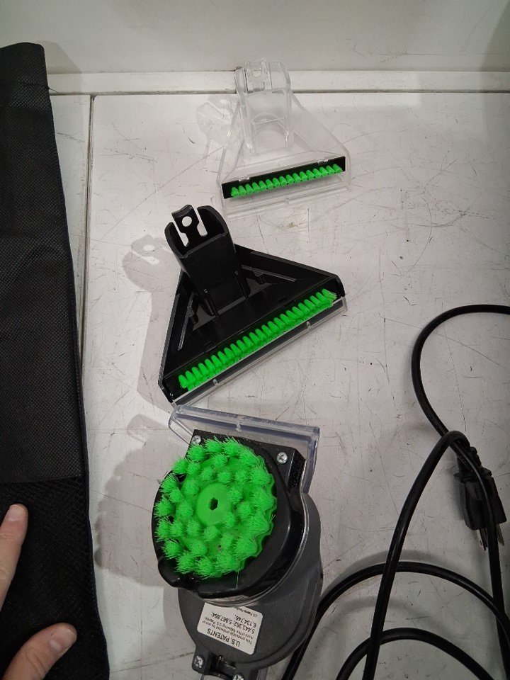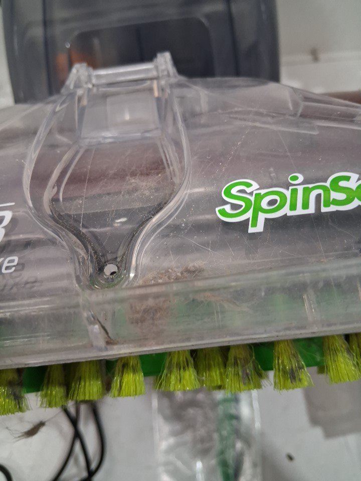 product has some dirt and debris present on the spin scrub brush head as well as lint and fluff attached to the brush head and inside the clear plastic above the brush, there is a wet tank with some left over water inside as well. and some other minor and light surface marks and stains on the handle and other areas of the product. product was tested for power.