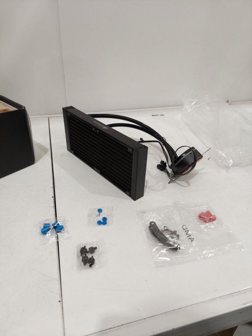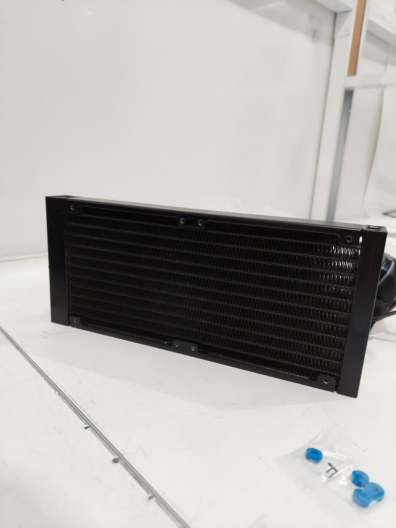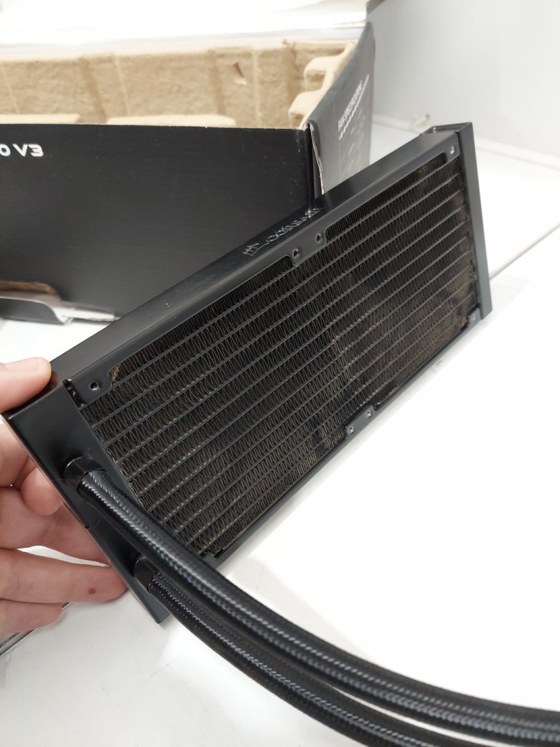 Item arrived with clear signs of prior use. there is minor dust and cosmetic dents on one side of the radiator that shows this. additionally this item arrived without much of the installation hardware and the fans and these will need to be replaced prior to use.