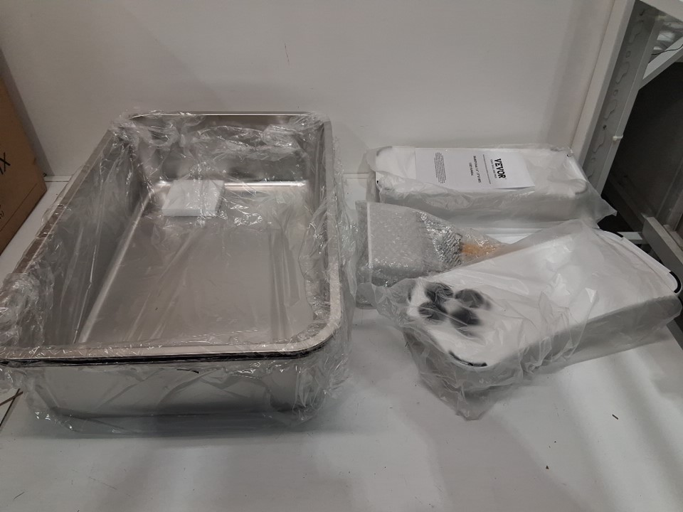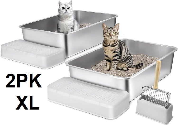 2pk Vevor stainless steel cat litter box with scoop and steps - 8" deep - XL - Silver/white