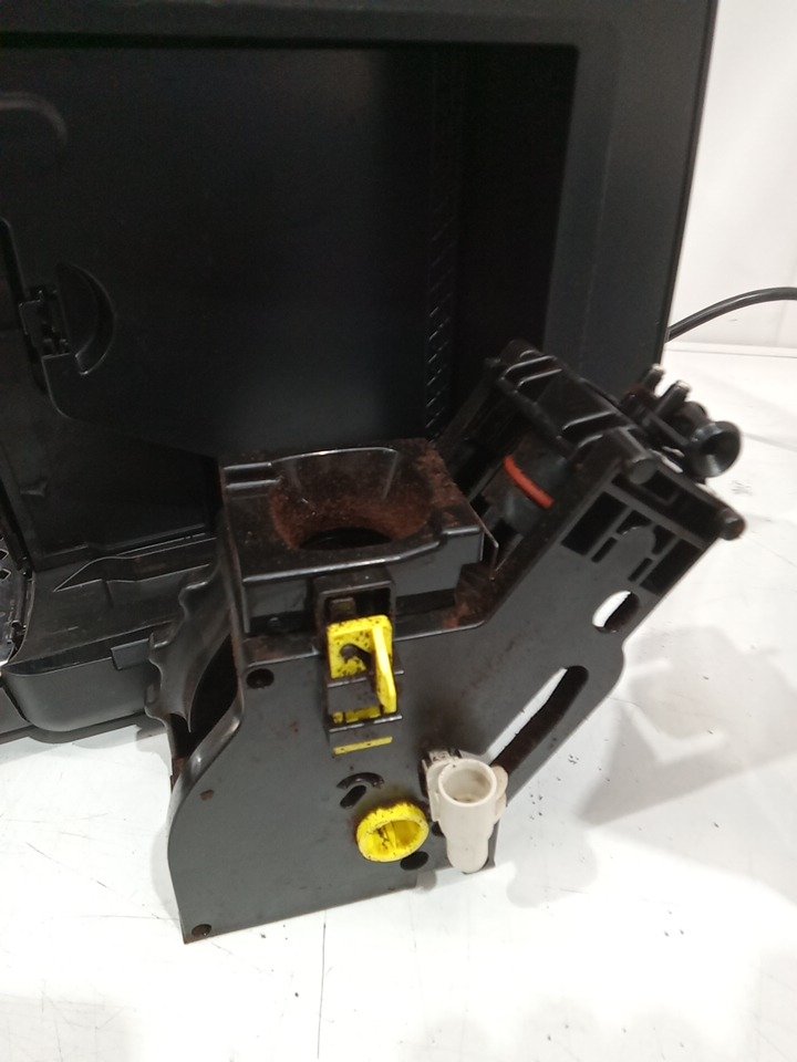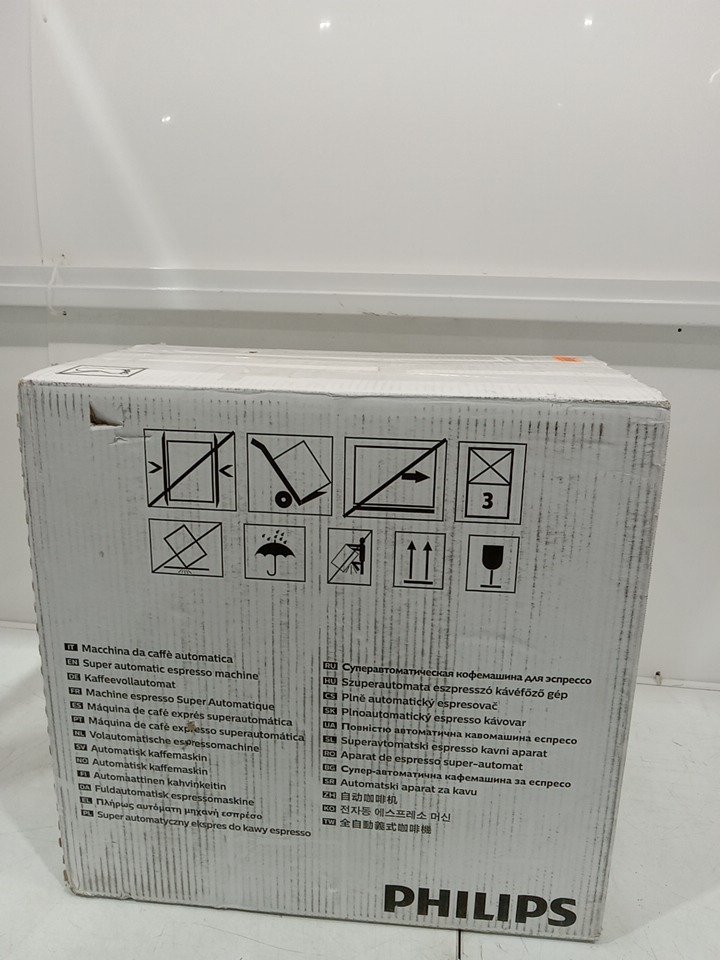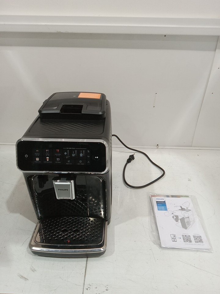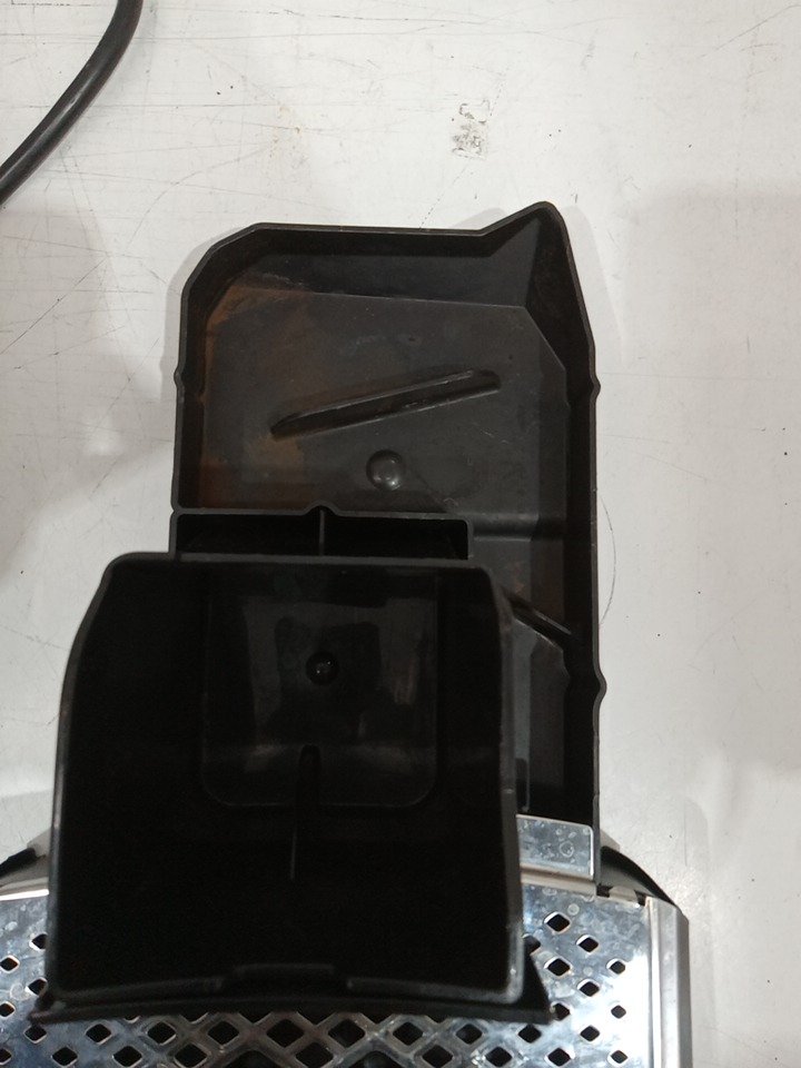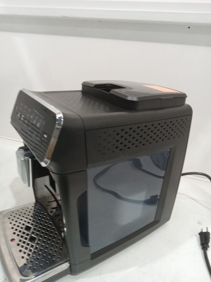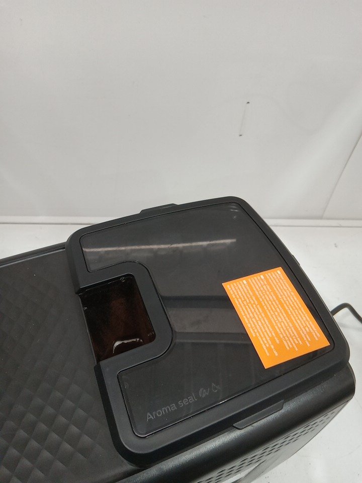 Please note that the all of the cleaning accessories, manual, LatteGo milk frother, top small grinder lid are missing from the original packaging. The top left side of the grinder’s plastic cover is missing from previous use, and we are not sure if it will affect the product’s functionality. The left side panel also has dents along the top edge due to prior use. Tested for basic power only. (Please see photos)