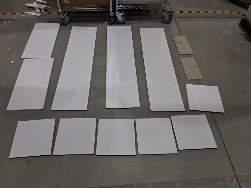 please note, this is a research based on the items we have as this item does not have an instruction manual. this does not come with hardware but could easily be put together with generic hardware. some of the corners do have small damages. please see photos
