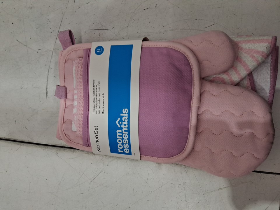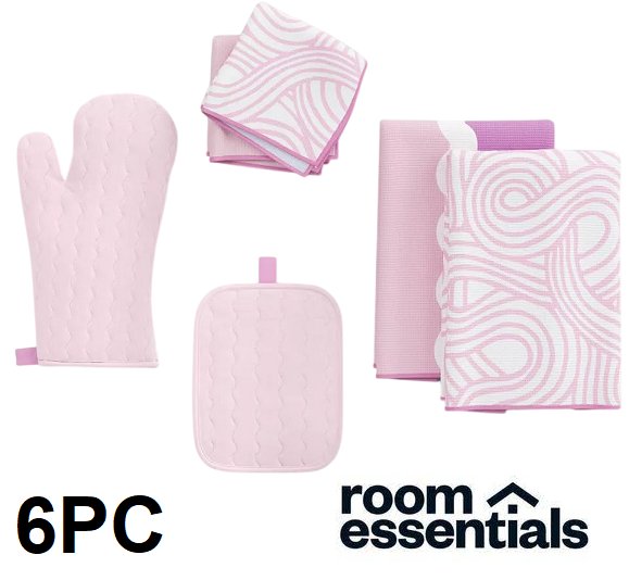 6PC ROOM ESSENTIALS KITCHEN SET - TOWELS, DISH CLOTH, POTHOLDER, GLOVES - PINK