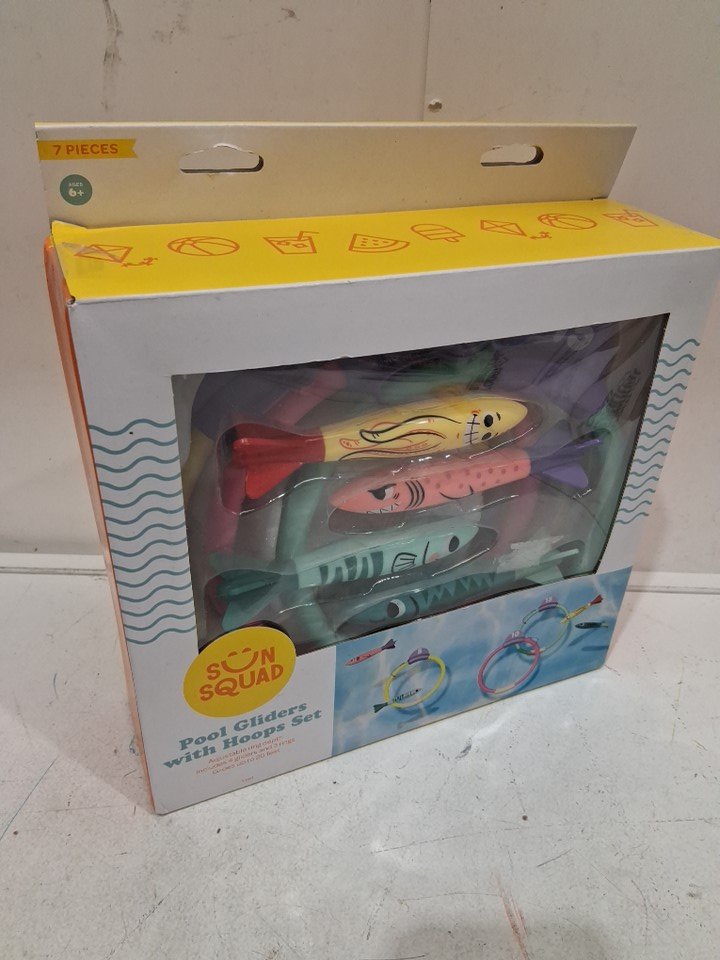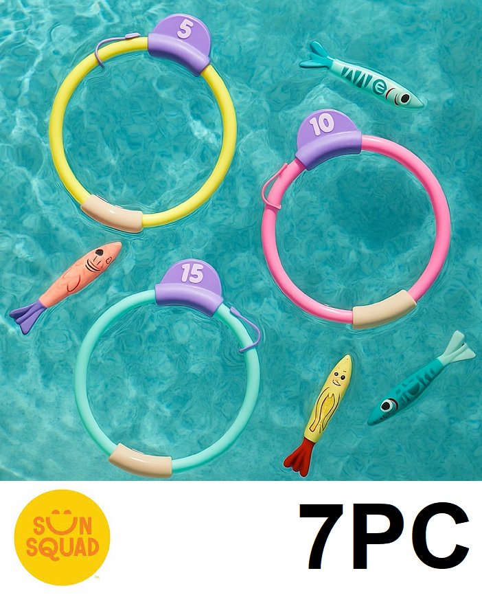 7PC SUN SQUAD HOOPS AND GLIDERS POOL DIVING SWIM TOYS - (3) RINGS, (4) GLIDERS