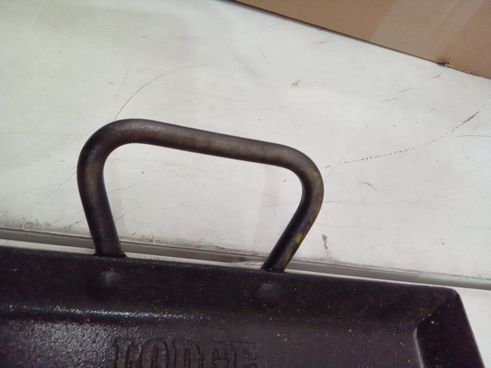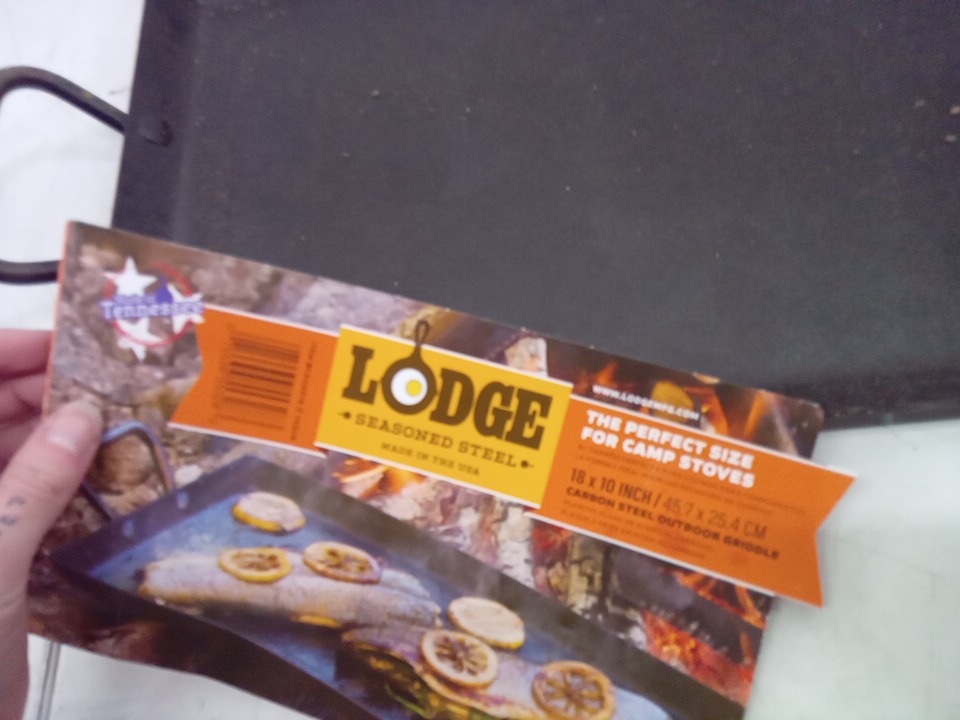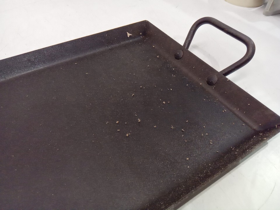 there are minor scuff marks and discoloration on the handles and cardboard on the pan.