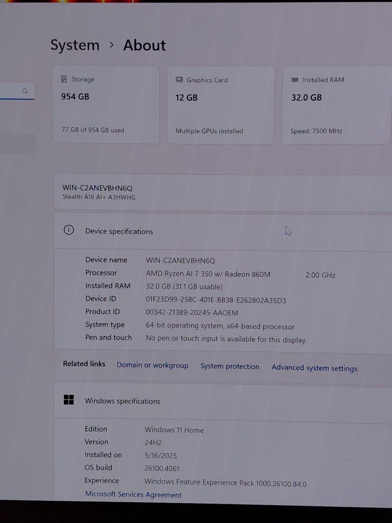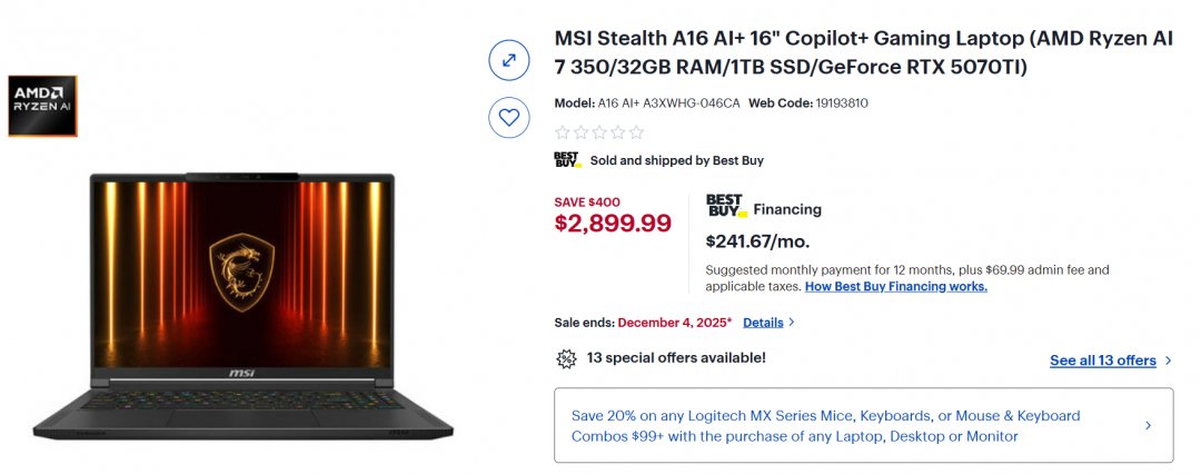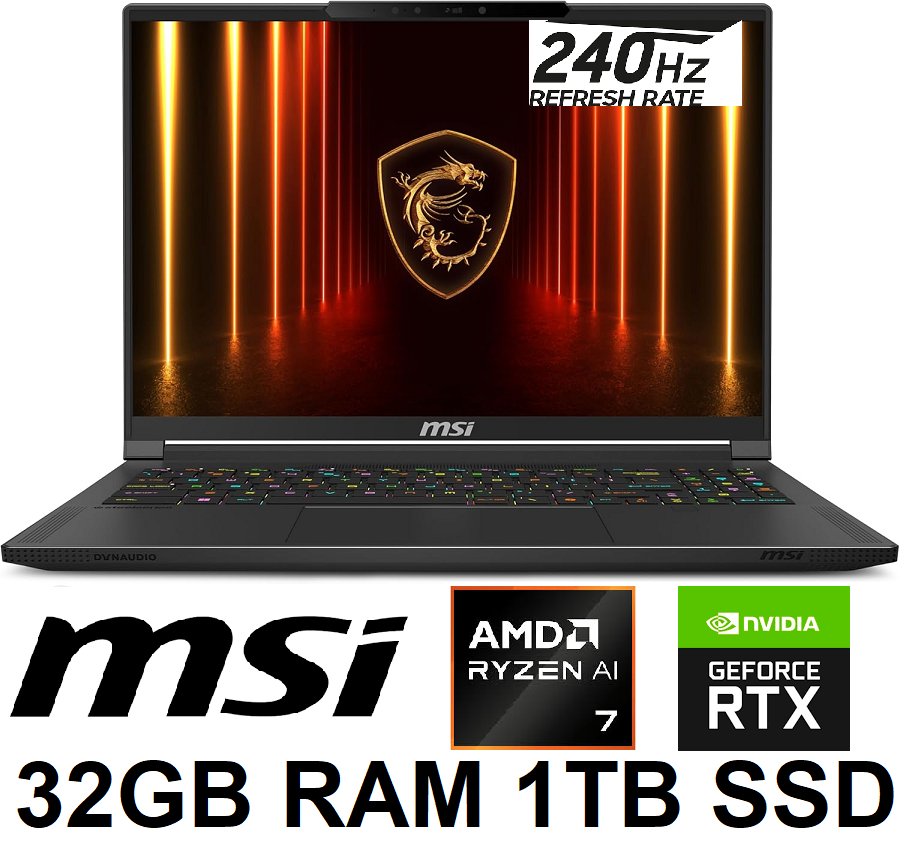 MSI Stealth A16 AI+ 16" QHD+ OLED 240Hz Gaming Laptop, AMD Ryzen AI 7-350, RTX 5070TI, 32GB LPDDR5x, 1TB NVMe SSD, Windows 11 Home (MODEL: A3XWHG-046CA)