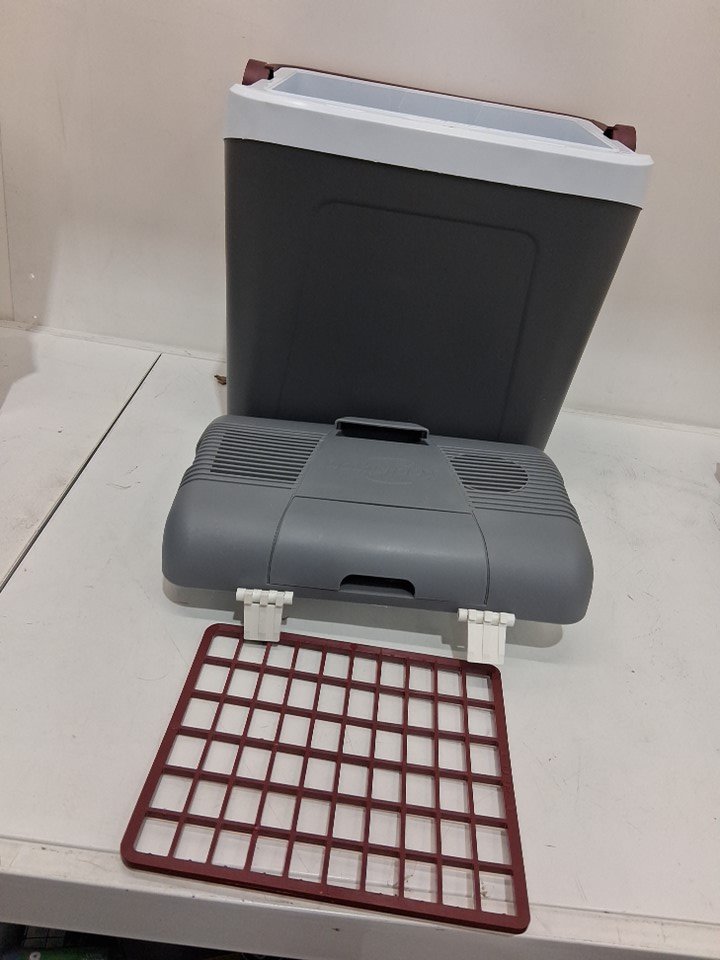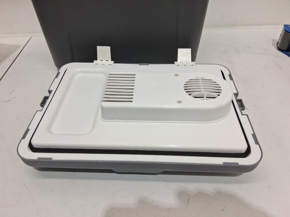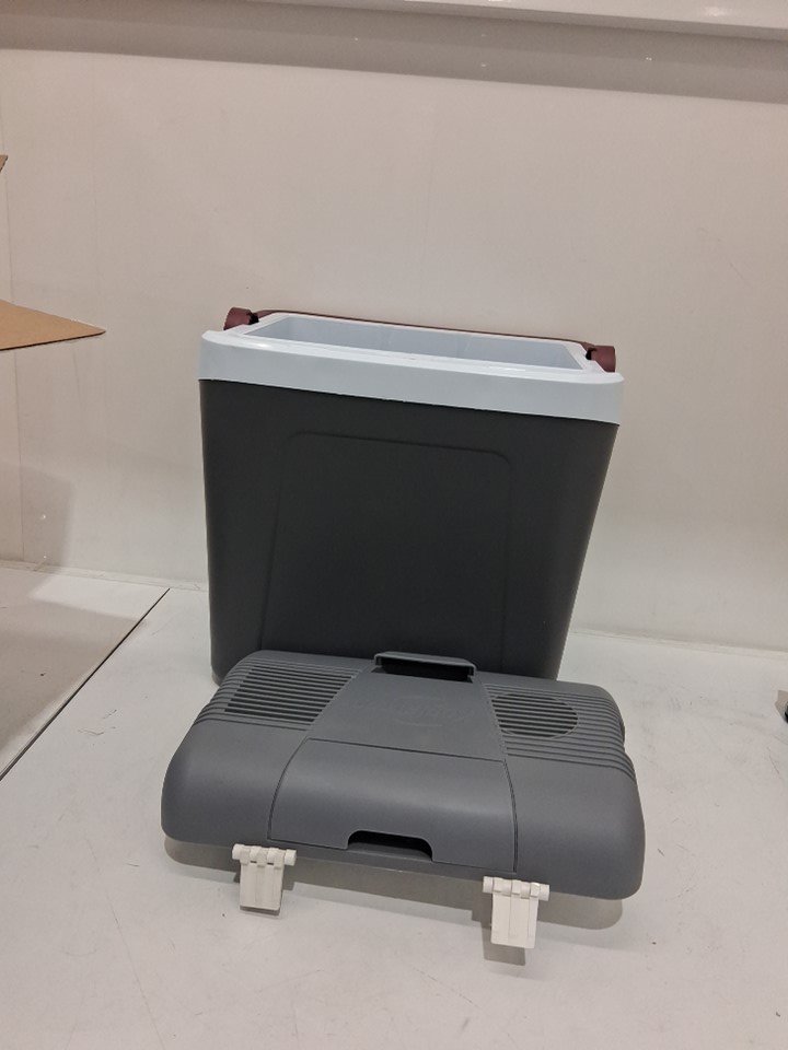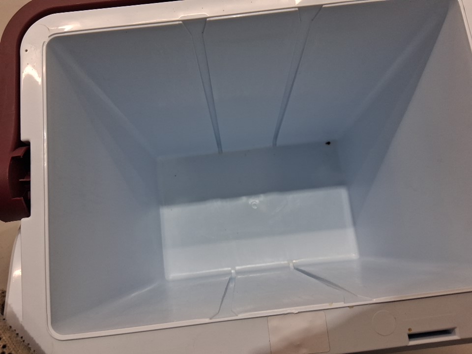 Tested for power. There are scratch marks on the sides and top, and minor water and dirt residue inside the cooler from previous use.