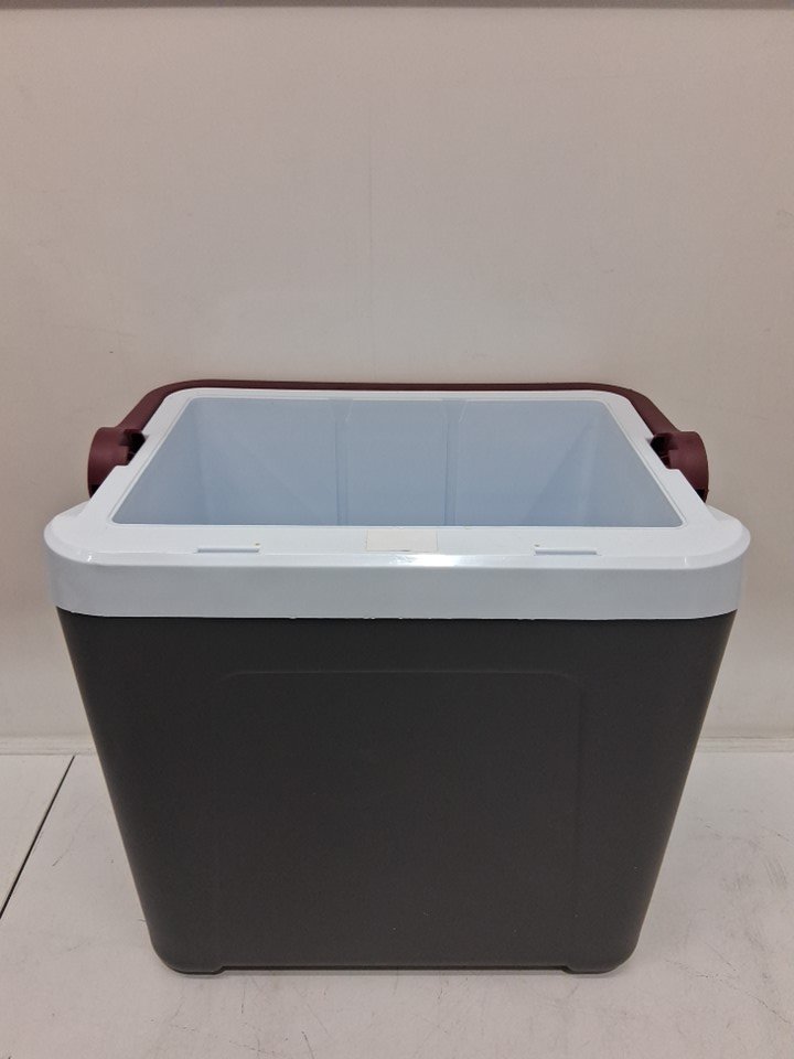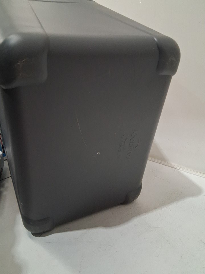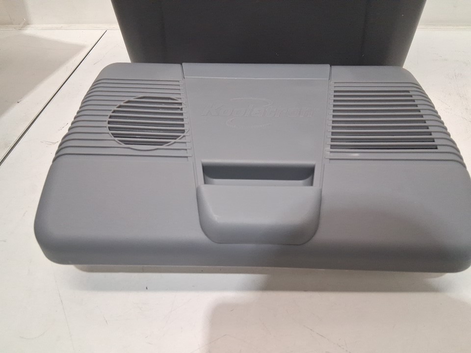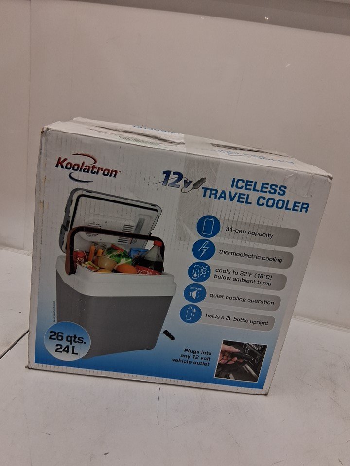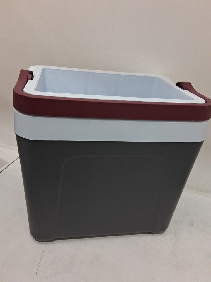 Tested for power. There are scratch marks on the sides and top, and minor water and dirt residue inside the cooler from previous use.