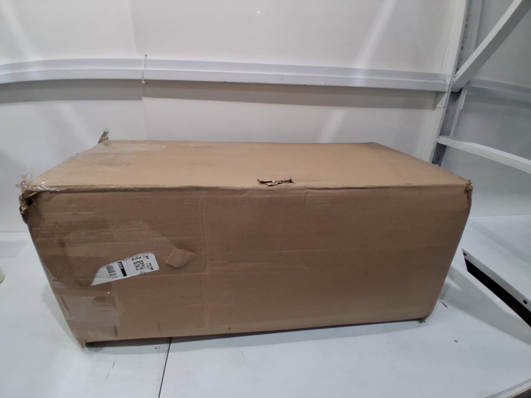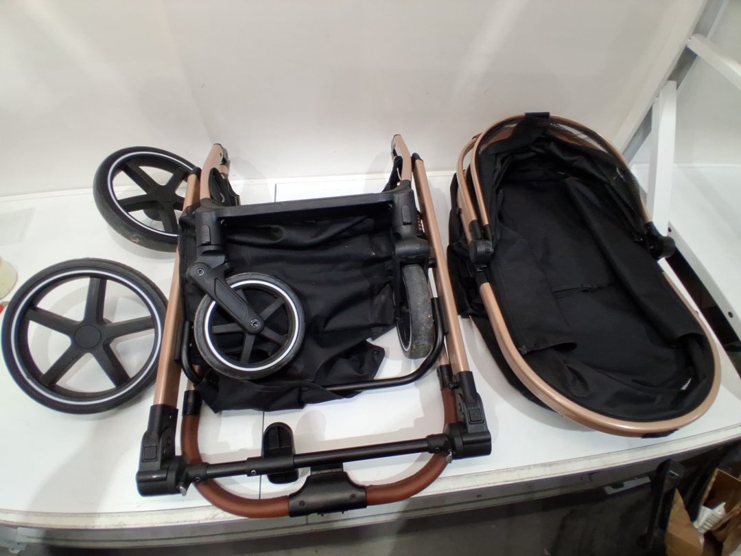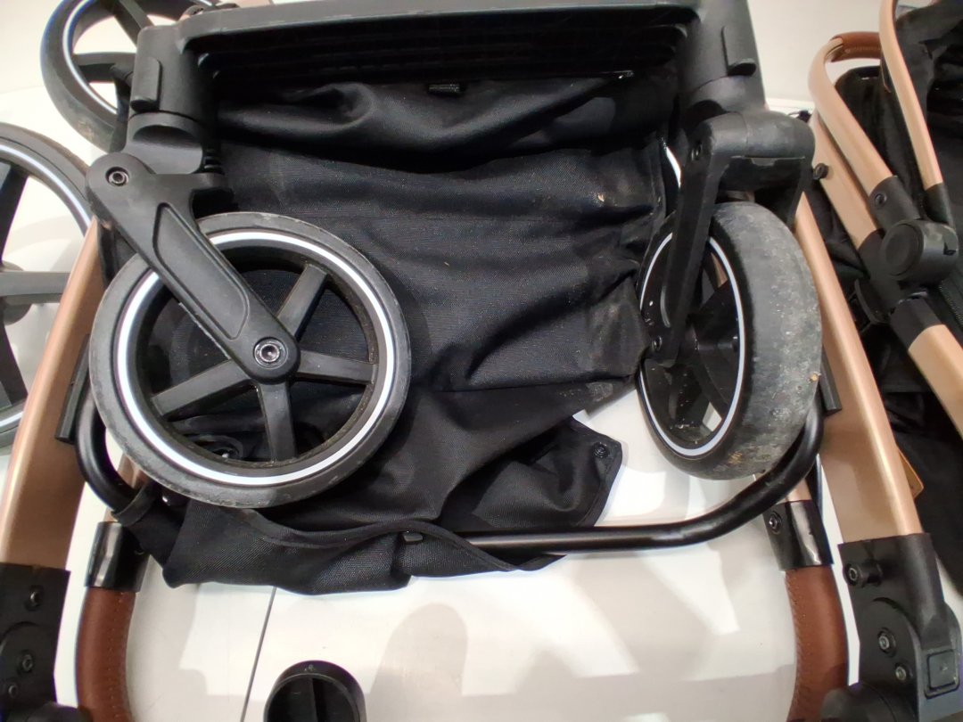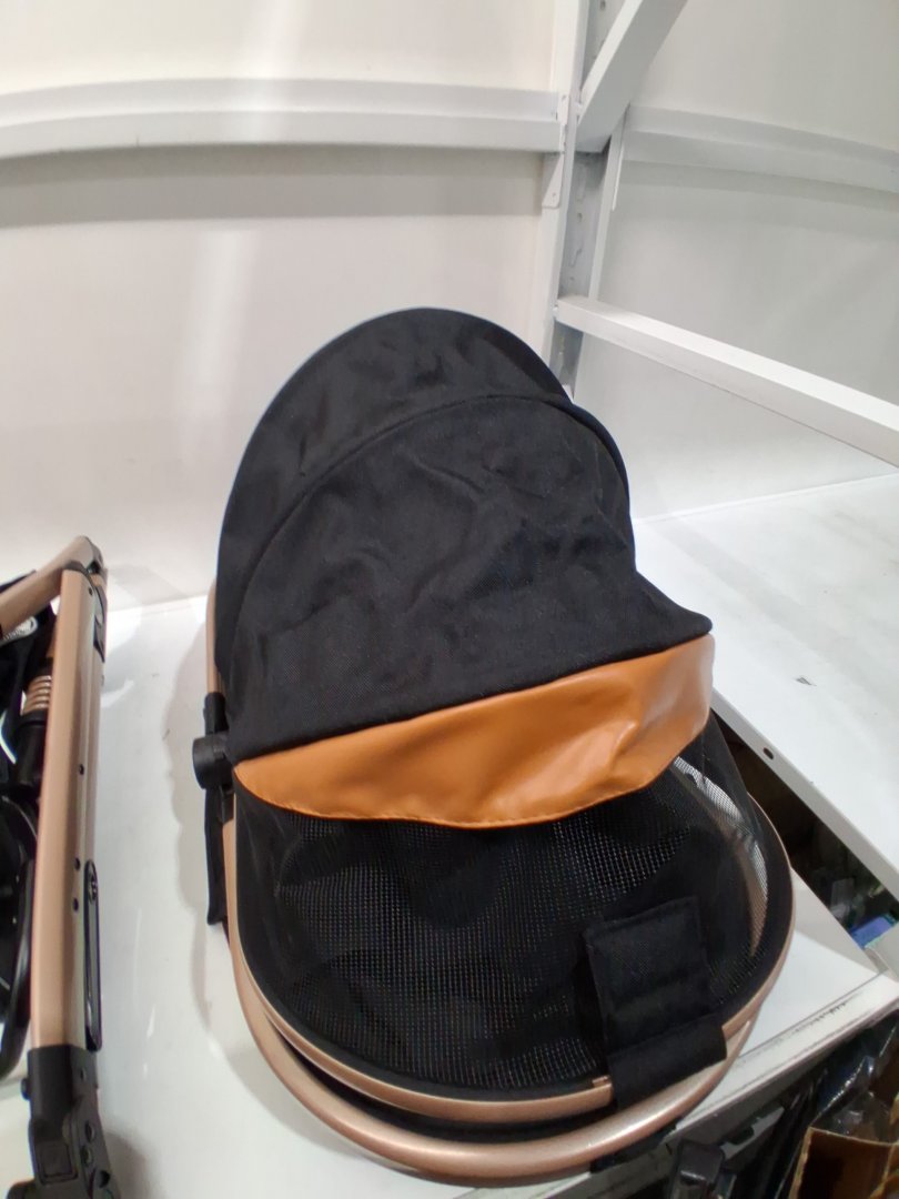 Item shows previous signs of use such as mild dirt/dust on inside of fabric area and on bottoms of wheels.